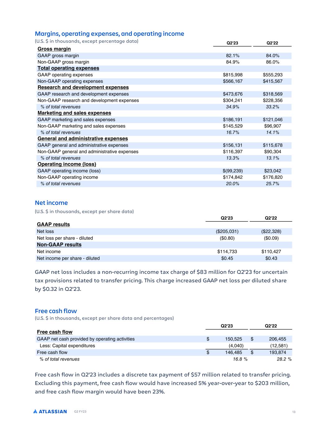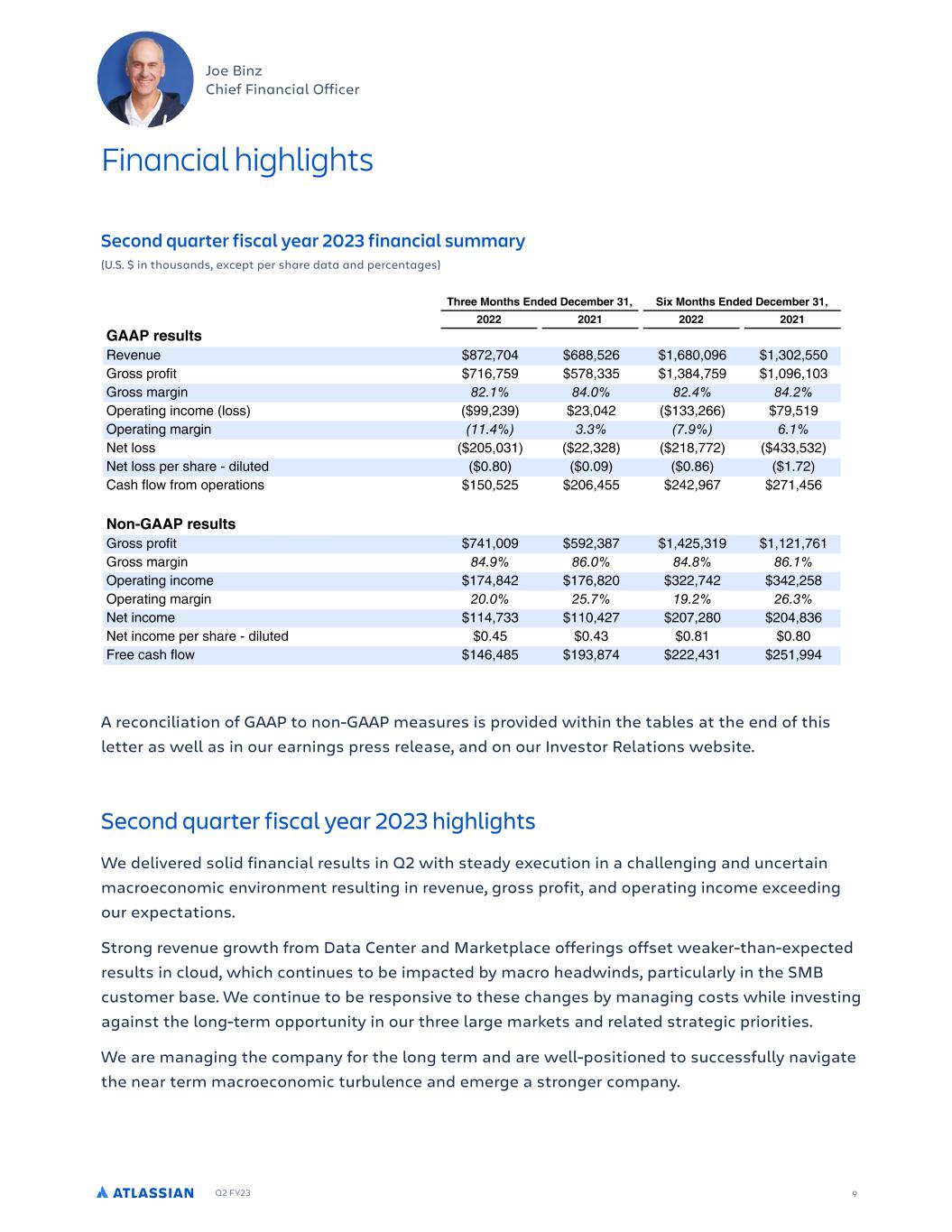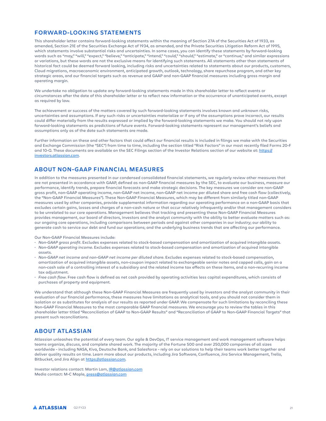 Q2 FY23 21 FORWARD-LOOKING STATEMENTS This shareholder letter contains forward-looking statements within the meaning of Section 27A of the Securities Act of 1933, as amended, Section 21E of the Securities Exchange Act of 1934, as amended, and the Private Securities Litigation Reform Act of 1995, which statements involve substantial risks and uncertainties. In some cases, you can identify these statements by forward-looking words such as “may,” “will,” “expect,” “believe,” “anticipate,” “intend,” “could,” “should,” “estimate,” or “continue,” and similar expressions or variations, but these words are not the exclusive means for identifying such statements. All statements other than statements of historical fact could be deemed forward looking, including risks and uncertainties related to statements about our products, customers, Cloud migrations, macroeconomic environment, anticipated growth, outlook, technology, share repurchase program, and other key strategic areas, and our financial targets such as revenue and GAAP and non-GAAP financial measures including gross margin and operating margin. We undertake no obligation to update any forward-looking statements made in this shareholder letter to reflect events or circumstances after the date of this shareholder letter or to reflect new information or the occurrence of unanticipated events, except as required by law. The achievement or success of the matters covered by such forward-looking statements involves known and unknown risks, uncertainties and assumptions. If any such risks or uncertainties materialize or if any of the assumptions prove incorrect, our results could differ materially from the results expressed or implied by the forward-looking statements we make. You should not rely upon forward-looking statements as predictions of future events. Forward-looking statements represent our management’s beliefs and assumptions only as of the date such statements are made. Further information on these and other factors that could affect our financial results is included in filings we make with the Securities and Exchange Commission (the “SEC”) from time to time, including the section titled “Risk Factors” in our most recently filed Forms 20-F and 10-Q. These documents are available on the SEC Filings section of the Investor Relations section of our website at: https:// investors.atlassian.com. ABOUT NON-GAAP FINANCIAL MEASURES In addition to the measures presented in our condensed consolidated financial statements, we regularly review other measures that are not presented in accordance with GAAP, defined as non-GAAP financial measures by the SEC, to evaluate our business, measure our performance, identify trends, prepare financial forecasts and make strategic decisions. The key measures we consider are non-GAAP gross profit, non-GAAP operating income, non-GAAP net income, non-GAAP net income per diluted share and free cash flow (collectively, the “Non-GAAP Financial Measures”). These Non-GAAP Financial Measures, which may be different from similarly titled non-GAAP measures used by other companies, provide supplemental information regarding our operating performance on a non-GAAP basis that excludes certain gains, losses and charges of a non-cash nature or that occur relatively infrequently and/or that management considers to be unrelated to our core operations. Management believes that tracking and presenting these Non-GAAP Financial Measures provides management, our board of directors, investors and the analyst community with the ability to better evaluate matters such as: our ongoing core operations, including comparisons between periods and against other companies in our industry; our ability to generate cash to service our debt and fund our operations; and the underlying business trends that are affecting our performance. Our Non-GAAP Financial Measures include: • Non-GAAP gross profit. Excludes expenses related to stock-based compensation and amortization of acquired intangible assets. • Non-GAAP operating income. Excludes expenses related to stock-based compensation and amortization of acquired intangible assets. • Non-GAAP net income and non-GAAP net income per diluted share. Excludes expenses related to stock-based compensation, amortization of acquired intangible assets, non-coupon impact related to exchangeable senior notes and capped calls, gain on a non-cash sale of a controlling interest of a subsidiary and the related income tax effects on these items, and a non-recurring income tax adjustment. • Free cash flow. Free cash flow is defined as net cash provided by operating activities less capital expenditures, which consists of purchases of property and equipment. We understand that although these Non-GAAP Financial Measures are frequently used by investors and the analyst community in their evaluation of our financial performance, these measures have limitations as analytical tools, and you should not consider them in isolation or as substitutes for analysis of our results as reported under GAAP. We compensate for such limitations by reconciling these Non-GAAP Financial Measures to the most comparable GAAP financial measures. We encourage you to review the tables in this shareholder letter titled “Reconciliation of GAAP to Non-GAAP Results” and “Reconciliation of GAAP to Non-GAAP Financial Targets” that present such reconciliations. ABOUT ATLASSIAN Atlassian unleashes the potential of every team. Our agile & DevOps, IT service management and work management software helps teams organize, discuss, and complete shared work. The majority of the Fortune 500 and over 250,000 companies of all sizes worldwide - including NASA, Kiva, Deutsche Bank, and Salesforce - rely on our solutions to help their teams work better together and deliver quality results on time. Learn more about our products, including Jira Software, Confluence, Jira Service Management, Trello, B