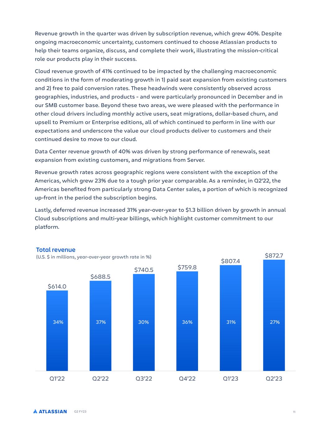 Q2 FY23 11 Revenue growth in the qu!rter w!s driven by subscription revenue, which grew 40%. Despite ongoing m!croeconomic uncert!inty, customers continued to choose Atl!ssi!n products to help their te!ms org!nize, discuss, !nd complete their work, illustr!ting the mission-critic!l role our products pl!y in their success. Cloud revenue growth of 41% continued to be imp!cted by the ch!llenging m!croeconomic conditions in the form of moder!ting growth in 1) p!id se!t exp!nsion from existing customers !nd 2) free to p!id conversion r!tes. These he!dwinds were consistently observed !cross geogr!phies, industries, !nd products - !nd were p!rticul!rly pronounced in December !nd in our SMB customer b!se. Beyond these two !re!s, we were ple!sed with the perform!nce in other cloud drivers including monthly !ctive users, se!t migr!tions, doll!r-b!sed churn, !nd upsell to Premium or Enterprise editions, !ll of which continued to perform in line with our expect!tions !nd underscore the v!lue our cloud products deliver to customers !nd their continued desire to move to our cloud. D!t! Center revenue growth of 40% w!s driven by strong perform!nce of renew!ls, se!t exp!nsion from existing customers, !nd migr!tions from Server. Revenue growth r!tes !cross geogr!phic regions were consistent with the exception of the Americ!s, which grew 23% due to ! tough prior ye!r comp!r!ble. As ! reminder, in Q2’22, the Americ!s benefited from p!rticul!rly strong D!t! Center s!les, ! portion of which is recognized up-front in the period the subscription begins. L!stly, deferred revenue incre!sed 31% ye!r-over-ye!r to $1.3 billion driven by growth in !nnu!l Cloud subscriptions !nd multi-ye!r billings, which highlight customer commitment to our pl!tform. Q1’22 Q2’22 Q3’22 Q4’22 Q1’23 Q2’23 $872.7 $807.4 $759.8$740.5 $688.5 $614.0 Total revenue (U.S. $ in millions, year-over-year growth rate in %) 30%37% 36%34% 31% 27%