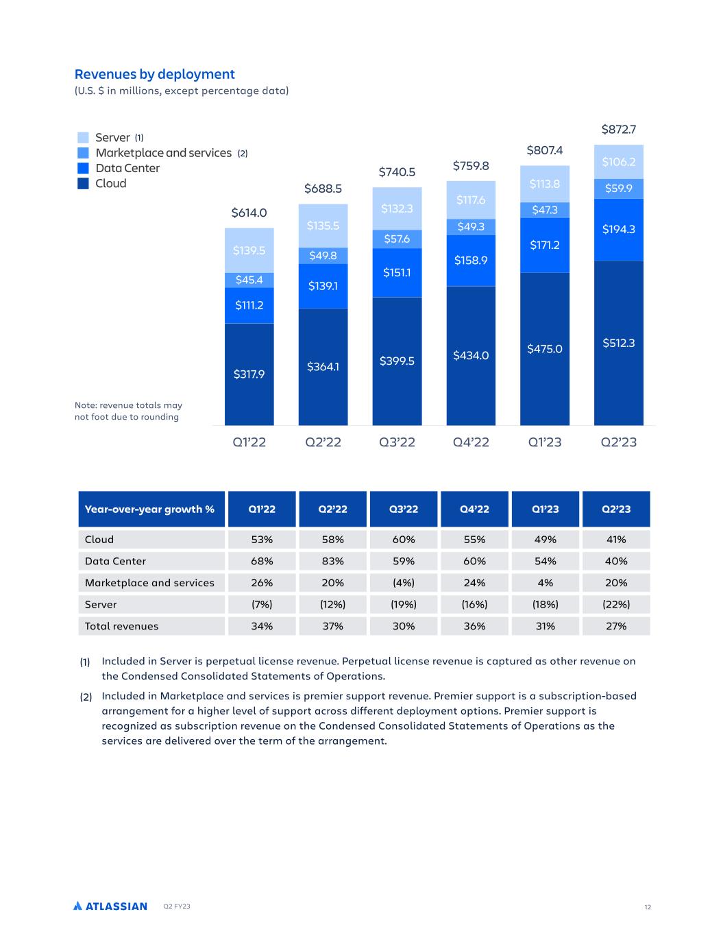 Q2 FY23 12 Year-over-year growth % Q1’22 Q2’22 Q3’22 Q4’22 Q1’23 Q2’23 Cloud 53% 58% 60% 55% 49% 41% Data Center 68% 83% 59% 60% 54% 40% Marketplace and services 26% 20% (4%) 24% 4% 20% Server (7%) (12%) (19%) (16%) (18%) (22%) Total revenues 34% 37% 30% 36% 31% 27% Included in Server is perpetual license revenue. Perpetual license revenue is captured as other revenue on the Condensed Consolidated Statements of Operations. (1) Included in Marketplace and services is premier support revenue. Premier support is a subscription-based arrangement for a higher level of support across different deployment options. Premier support is recognized as subscription revenue on the Condensed Consolidated Statements of Operations as the services are delivered over the term of the arrangement. (2) (U.S. $ in millions, except percentage data) Revenues by deployment $872.7 $807.4 $759.8$740.5 $688.5 $614.0 Q1’22 Q2’22 Q3’22 Q4’22 Q1’23 Q2’23 $106.2 $113.8 $117.6 $132.3 $135.5 $139.5 $59.9 $47.3 $49.3 $57.6 $49.8 $45.4 $194.3 $171.2 $158.9 $151.1 $139.1 $111.2 $512.3$475.0$434.0$399.5$364.1$317.9 Cloud Data Center Marketplace and services Server (2) (1) Note: revenue totals may not foot due to rounding