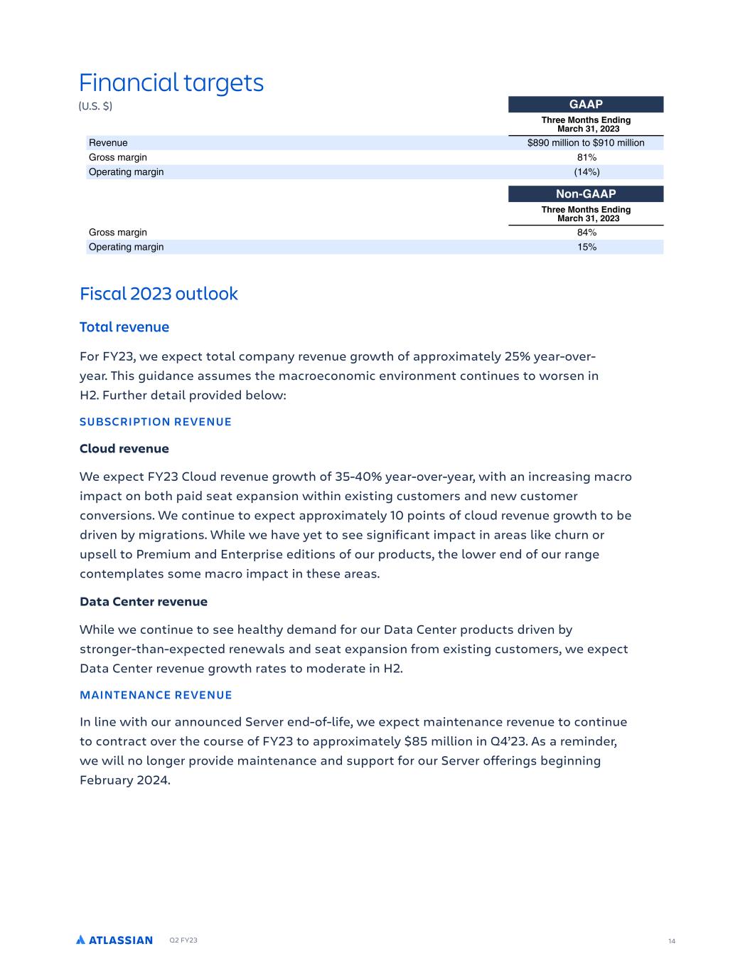 Q2 FY23 3JN NDJ L R FTS  4 IRFF 8ONTIS 2NEJN 8 RDI )'$ ( () FWFO F . N MM PO P N MM PO 7SPTT NBS O . FSB O NBS O 9ON%4 IRFF 8ONTIS 2NEJN 8 RDI )'$ ( () 7SPTT NBS O . FSB O NBS O 14 Financial targets (U.S. $) Fiscal 2023 outlook Total revenue For FY23, we expect tot!l comp!ny revenue growth of !pproxim!tely 25% ye!r-over- ye!r. This guid!nce !ssumes the m!croeconomic environment continues to worsen in H2. Further det!il provided below: SUBSCRIPTION REVENUE Cloud revenue We expect FY23 Cloud revenue growth of 35-40% ye!r-over-ye!r, with !n incre!sing m!cro imp!ct on both p!id se!t exp!nsion within existing customers !nd new customer conversions. We continue to expect !pproxim!tely 10 points of cloud revenue growth to be driven by migr!tions. While we h!ve yet to see signific!nt imp!ct in !re!s like churn or upsell to Premium !nd Enterprise editions of our products, the lower end of our r!nge contempl!tes some m!cro imp!ct in these !re!s. D!t! Center revenue While we continue to see he!lthy dem!nd for our D!t! Center products driven by stronger-th!n-expected renew!ls !nd se!t exp!nsion from existing customers, we expect D!t! Center revenue growth r!tes to moder!te in H2. MAINTENANCE REVENUE In line with our !nnounced Server end-of-life, we expect m!inten!nce revenue to continue to contr!ct over the course of FY23 to !pproxim!tely $85 million in Q4’23. As ! reminder, we will no longer provide m!inten!nce !nd support for our Server offerings beginning Febru!ry 2024.