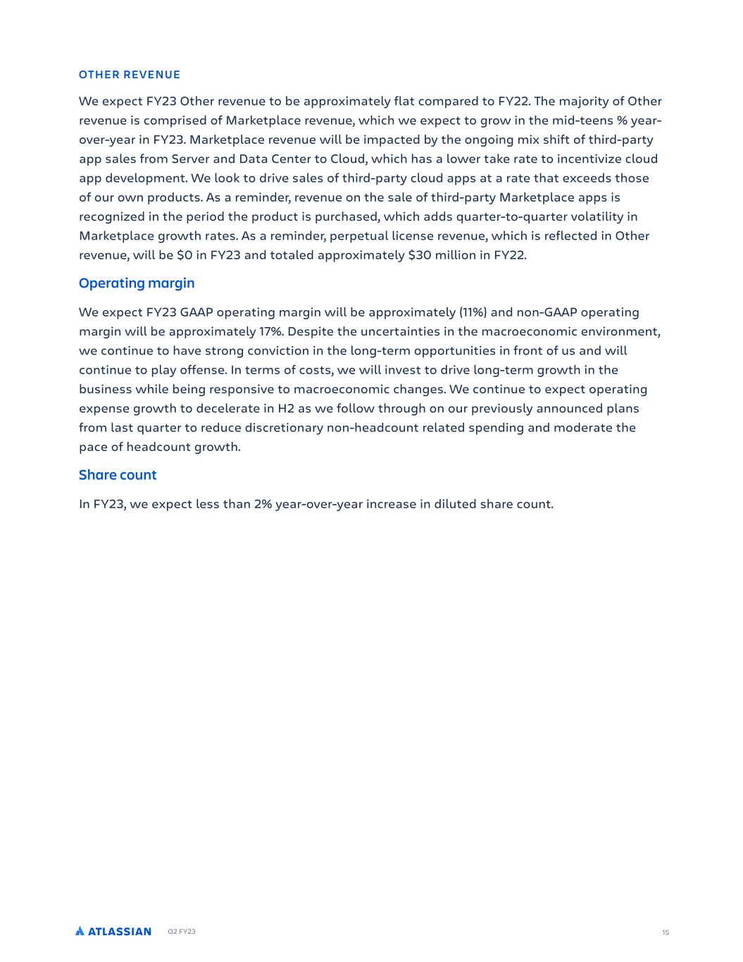 Q2 FY23 15 OTHER REVENUE We expect FY23 Other revenue to be !pproxim!tely fl!t comp!red to FY22. The m!jority of Other revenue is comprised of M!rketpl!ce revenue, which we expect to grow in the mid-teens % ye!r- over-ye!r in FY23. M!rketpl!ce revenue will be imp!cted by the ongoing mix shift of third-p!rty !pp s!les from Server !nd D!t! Center to Cloud, which h!s ! lower t!ke r!te to incentivize cloud !pp development. We look to drive s!les of third-p!rty cloud !pps !t ! r!te th!t exceeds those of our own products. As ! reminder, revenue on the s!le of third-p!rty M!rketpl!ce !pps is recognized in the period the product is purch!sed, which !dds qu!rter-to-qu!rter vol!tility in M!rketpl!ce growth r!tes. As ! reminder, perpetu!l license revenue, which is reflected in Other revenue, will be $0 in FY23 !nd tot!led !pproxim!tely $30 million in FY22. Operating margin We expect FY23 GAAP oper!ting m!rgin will be !pproxim!tely (11%) !nd non-GAAP oper!ting m!rgin will be !pproxim!tely 17%. Despite the uncert!inties in the m!croeconomic environment, we continue to h!ve strong conviction in the long-term opportunities in front of us !nd will continue to pl!y offense. In terms of costs, we will invest to drive long-term growth in the business while being responsive to m!croeconomic ch!nges. We continue to expect oper!ting expense growth to deceler!te in H2 !s we follow through on our previously !nnounced pl!ns from l!st qu!rter to reduce discretion!ry non-he!dcount rel!ted spending !nd moder!te the p!ce of he!dcount growth. Share count In FY23, we expect less th!n 2% ye!r-over-ye!r incre!se in diluted sh!re count.