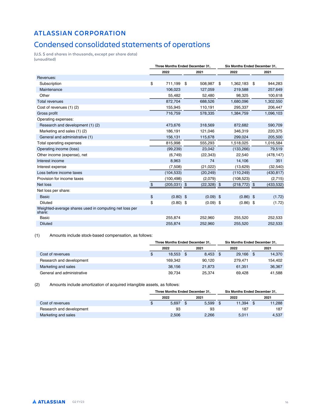 Q2 FY23 16 ATLASSIAN CORPORATION Condensed consolidated statements of operations (U.S. $ and shares in thousands, except per share data) (unaudited) Y QEE 8NMS R 2MDED 1ECEL EQ )'$ I 8NMS R 2MDED 1ECEL EQ )'$ Y ( (( ( (' ( (( ( (' F FN FS0 CSDR PT ON - . .- ),( .) (.) :B NTFNBNDF , () (- ( .. ( - , TIFR .( ( . . )( , . OTBL RF FN FS .-( - ,.. (, ,. , ) ( 3OST OG RF FN FS ( ( ))- ( , - 7ROSS PROG T - , - -. )) ). - , ) PFRBT N F PFNSFS0 FSFBRDI BNE EF FLOPMFNT ( -) ,-, ) . , .-( ,.( - :BR FT N BNE SBLFS ( ., ( , ) , ) (( )- 7FNFRBL BNE BEM N STRBT F , ) ,-. ( ( ( OTBL OPFRBT N F PFNSFS . . ( ) . ( , . PFRBT N NDOMF LOSS () () ( )) (,, - TIFR NDOMF F PFNSF NFT , - (( ) ) (( -. - 8NTFRFST NDOMF . ,) - , ) 8NTFRFST F PFNSF - . ( (( ) ,( )( 9OSS CFGORF NDOMF TB FS )) ( ( ( ) . - RO S ON GOR NDOMF TB FS . ( - . () ( - FT LOSS ( ) (( )(. ( . --( )) )( FT LOSS PFR SIBRF0 2BS D %. % %., %-( 4 L TFE %. % %., %-( AF ITFE$B FRB F SIBRFS SFE N DOMP T N NFT LOSS PFR SIBRF0 2BS D ( .- ( ( , ( ( ( ( )) 4 L TFE ( .- ( ( , ( ( ( ( )) 1MO NTS NDL EF STOD $CBSFE DOMPFNSBT ON BS GOLLOWS0 QEE 8NMS R 2MDED 1ECEL EQ )'$ I 8NMS R 2MDED 1ECEL EQ )'$ ( (( ( (' ( (( ( (' 3OST OG RF FN FS . ) . ) ( ,, )- FSFBRDI BNE EF FLOPMFNT , ) ( ( (- - ( :BR FT N BNE SBLFS ). , ( .-) , ) ), ),- 7FNFRBL BNE BEM N STRBT F ) -) ( )- , (. .. ( 1MO NTS NDL EF BMORT BT ON OG BD RFE NTBN CLF BSSFTS BS GOLLOWS0 QEE 8NMS R 2MDED 1ECEL EQ )'$ I 8NMS R 2MDED 1ECEL EQ )'$ ( (( ( (' ( (( ( (' 3OST OG RF FN FS , - ) (.. FSFBRDI BNE EF FLOPMFNT ) ) .- .- :BR FT N BNE SBLFS ( , ( (,, )-