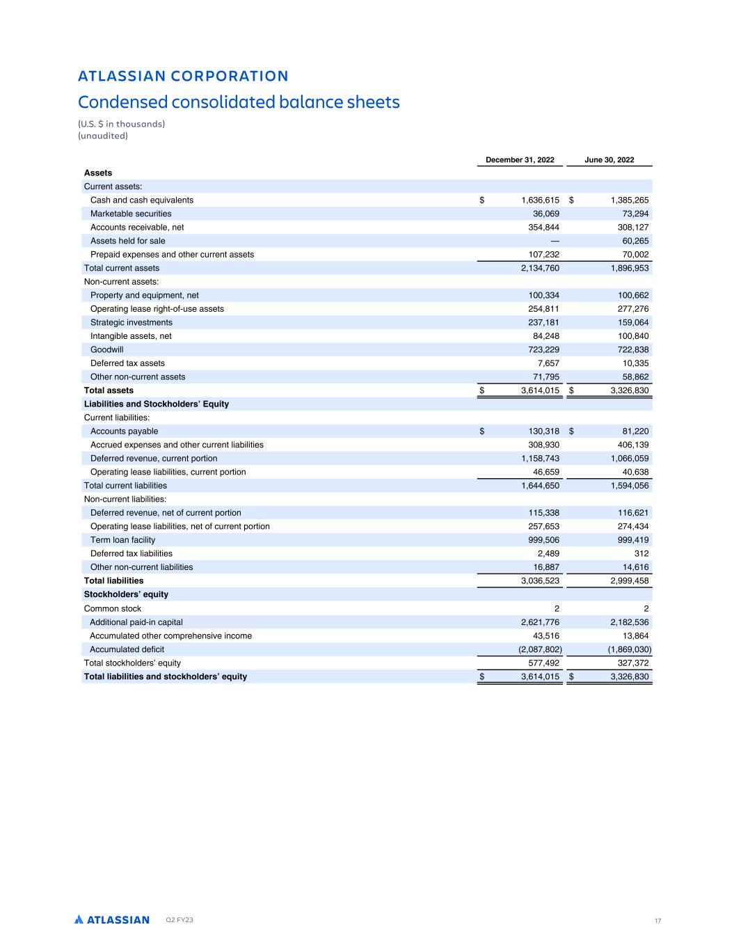 Q2 FY23 17 ATLASSIAN CORPORATION Condensed consolidated balance sheets (U.S. $ in thousands) (unaudited) 1ECEL EQ )'$ ( (( TME ) $ ( (( RRESR 3 RRFNT BSSFTS0 3BSI BNE DBSI F BLFNTS ,), , ). (, :BR FTBCLF SFD R T FS ), , -) ( 1DDO NTS RFDF BCLF NFT ) . ) . (- 1SSFTS IFLE GOR SBLF , (, RFPB E F PFNSFS BNE OTIFR D RRFNT BSSFTS - ()( - ( OTBL D RRFNT BSSFTS ( ) -, . , ) ON$D RRFNT BSSFTS0 ROPFRT BNE F PMFNT NFT )) ,,( PFRBT N LFBSF R IT$OG$ SF BSSFTS ( . (-- (-, TRBTF D N FSTMFNTS ()- . , 8NTBN CLF BSSFTS NFT . ( . . 7OOEW LL -() (( -(( .). 4FGFRRFE TB BSSFTS - , - )) TIFR NON$D RRFNT BSSFTS - - . .,( NSA ARRESR ) , ) )(, .) IA I ISIER AMD SNCJ N DEQR 2PTIS 3 RRFNT L BC L T FS0 1DDO NTS PB BCLF ) ) . . (( 1DDR FE F PFNSFS BNE OTIFR D RRFNT L BC L T FS ) . ) , ) 4FGFRRFE RF FN F D RRFNT PORT ON . - ) ,, PFRBT N LFBSF L BC L T FS D RRFNT PORT ON , , ,). OTBL D RRFNT L BC L T FS , , , ON$D RRFNT L BC L T FS0 4FGFRRFE RF FN F NFT OG D RRFNT PORT ON )). , ,( PFRBT N LFBSF L BC L T FS NFT OG D RRFNT PORT ON ( - , ) (- ) FRM LOBN GBD L T , 4FGFRRFE TB L BC L T FS ( . ) ( TIFR NON$D RRFNT L BC L T FS , ..- , , NSA IA I ISIER ) ), () ( . SNCJ N DEQR EPTIS 3OMMON STOD ( ( 1EE T ONBL PB E$ N DBP TBL ( ,( --, ( .( ), 1DD M LBTFE OTIFR DOMPRFIFNS F NDOMF ) , ) ., 1DD M LBTFE EFG D T ( .- . ( ., ) OTBL STOD IOLEFRS F T -- ( )(- )-( NSA IA I ISIER AMD RSNCJ N DEQR EPTIS ) , ) )(, .)