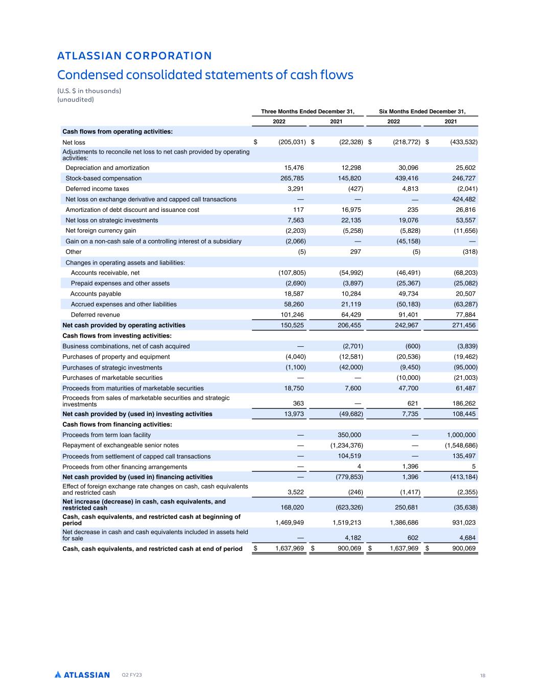 Q2 FY23 18 ATLASSIAN CORPORATION Condensed consolidated statements of cash flows (U.S. $ in thousands) (unaudited) QEE 8NMS R 2MDED 1ECEL EQ )'$ I 8NMS R 2MDED 1ECEL EQ )'$ ( (( ( (' ( (( ( (' 0AR F N R FQNL NOEQASIMG ACSI ISIER E DD ( ) (( )(. ( . --( )) )( FDE ED E C : E DD E E D AC G: A C E: E:G:E: D 4FPRFD BT ON BNE BMORT BT ON -, ( ( . ) , ( , ( TOD $CBSFE DOMPFNSBT ON (, -. .( ) , ( , -(- 4FGFRRFE NDOMF TB FS ) ( (- . ) ( FT LOSS ON F DIBN F EFR BT F BNE DBPPFE DBLL TRBNSBDT ONS L ( .( 1MORT BT ON OG EFCT E SDO NT BNE SS BNDF DOST - , - () (, . , FT LOSS ON STRBTF D N FSTMFNTS - ,) (( ) -, ) - FT GORF N D RRFND B N ( ( ) ( . .(. , , 7B N ON B NON$DBSI SBLF OG B DONTROLL N NTFRFST OG B S CS E BR ( ,, . TIFR ( - ) . D : A C E: DD ED : : :E: D 1DDO NTS RFDF BCLF NFT - . ( , ,. ( ) RFPB E F PFNSFS BNE OTIFR BSSFTS ( , ) . - ( ),- ( .( F ED A . .- (. -) ( - 1DDR FE F PFNSFS BNE OTIFR L BC L T FS . (, ( .) ,) (.- 4FGFRRFE RF FN F ( , , ( -- .. 9ES CAR OQN IDED NOEQASIMG ACSI ISIER ( ( , ( ( ,- (- , 0AR F N R FQNL IM ERSIMG ACSI ISIER FD: DD : E: D E D BF:C ( - , ) .) FC D D AC A CE BF:A E ( . ( ), ,( FC D D DEC E : : G DE ED ( FC D D C E D FC:E: D ( ) C D C EFC:E: D C E D FC:E: D . - - , - - , .- C D C D D C E D FC:E: D DEC E : : G DE ED ),) ,( ., (,( 9ES CAR OQN IDED TRED IM IM ERSIMG ACSI ISIER ) -) ,.( - -) . 0AR F N R FQNL FIMAMCIMG ACSI ISIER C D C E C : :E ) FPB MFNT OG F DIBN FBCLF SFN OR NOTFS () )-, . ,., C D C D EE E AA EC D E: D ) - C D C E C : : CC ED ) , 9ES CAR OQN IDED TRED IM FIMAMCIMG ACSI ISIER -- . ) ) , ) . ) E C : I C E D D D BF:G ED C DEC: E D ) (( ( , - ( ) - C 2 2 2 2 D E2 C 2 C C 2 ,. ( ,() )(, ( ,. ) ,). 2 2 D E2 C 2 C C 2 2C 3 , ( ) )., ,., ) () E C D : D D BF:G ED : F : DD ED C D .( , ( ,. 2 2 D E2 C 2 C C 2 2C ,)- , , ,)- , ,