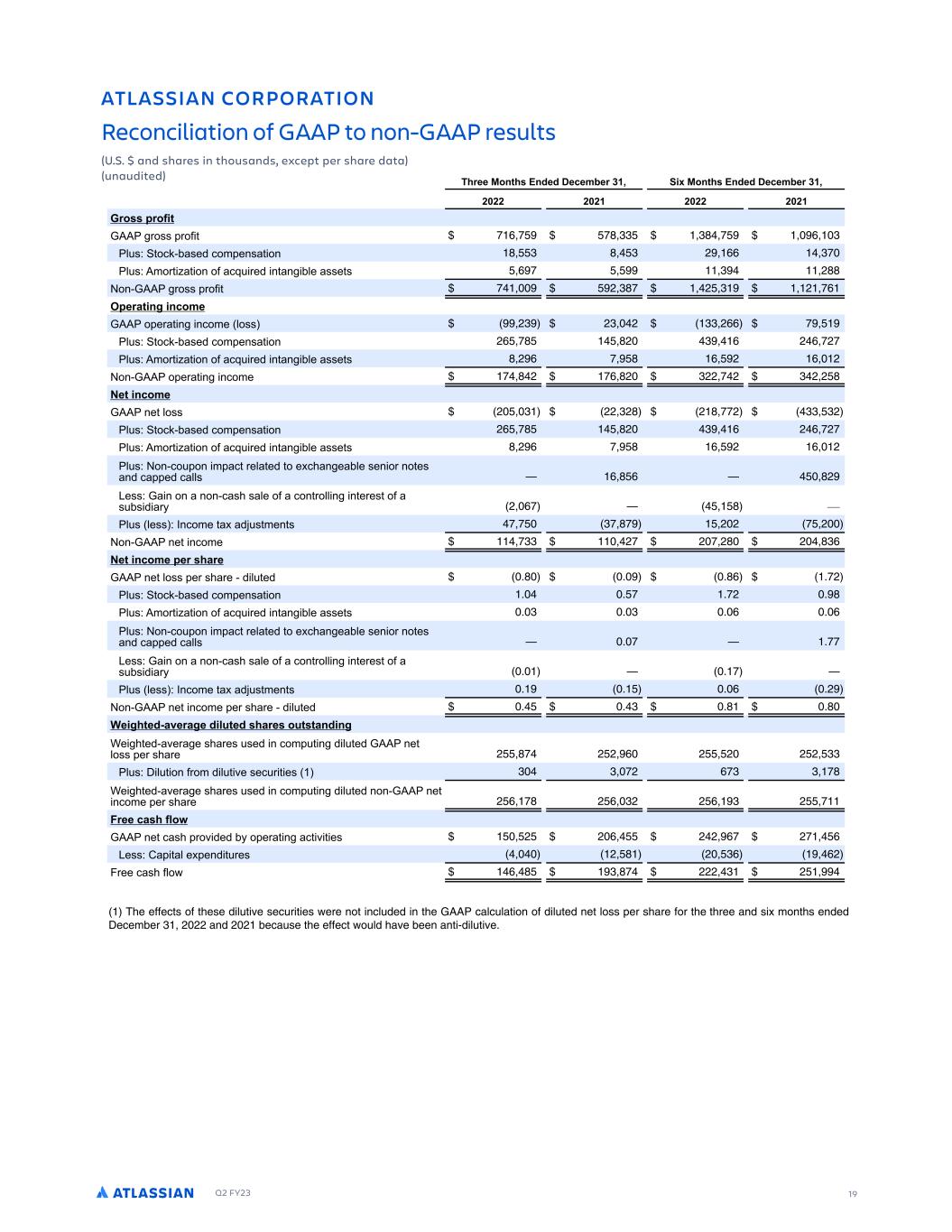 Q2 FY23 19 ATLASSIAN CORPORATION Reconciliation of GAAP to non-GAAP results (U.S. $ and shares in thousands, except per share data) (unaudited)Y 0 , C ) ( 3 G , C ) ( 3 Y C C DD AC :E - , - -. )) ). - , ) FD E D A D E: . ) . ) ( ,, )- FD CE: E: BF:C : E : DD ED , - ) (.. C DD AC :E - ( ).- ( ) ( -, 2C A C E: : DD () () ( )) (,, - FD E D A D E: (, -. .( ) , ( , -(- FD CE: E: BF:C : E : DD ED . ( , - . , ( , ( A C E: : - . ( -, .( )(( - ( ) ( ( . - C E DD ( ) (( )(. ( . --( )) )( FD E D A D E: (, -. .( ) , ( , -(- FD CE: E: BF:C : E : DD ED . ( , - . , ( , ( FD FA : A E C E E I D : C E D AA D , . , .( - DD : D D EC : : E C DE DF D: : C ( ,- .   FD DD , E I FDE ED - - )- .- ( ( - ( E : -)) (- ( - (. ( .), - C 2 E DD A C D C : FE %. % %., %-( FD E D A D E: % % - %-( % . FD CE: E: BF:C : E : DD ED % ) % ) % , % , FD FA : A E C E E I D : C E D AA D % - %-- - DD : D D EC : : E C DE DF D: : C % % - FD DD , E I FDE ED % % % , %( E : A C D C : FE % % ) %. %. 1 C 2E 2 DC 2 DC C2 1 : E G C D C D FD : AFE: : FE E DD A C D C ( .- ( ( , ( ( ( ( )) FD (: FE: C : FE:G D FC:E: D ) ) -( ,-) ) -. 1 : E G C D C D FD : AFE: : FE E : A C D C ( , -. ( , )( ( , ) ( - 2 F E D AC G: A C E: E:G:E: D ( ( , ( ( ,- (- , - DD A:E IA :EFC D ( . ( ), ,( C D , . ) .- ((( ) ( IF FGGFDTS OG TIFSF E L T F SFD R T FS WFRF NOT NDL EFE N TIF 711 DBLD LBT ON OG E L TFE NFT LOSS PFR SIBRF GOR TIF TIRFF BNE S MONTIS FNEFE 4FDFMCFR ) ( (( BNE ( ( CFDB SF TIF FGGFDT WO LE IB F CFFN BNT $E L T F%