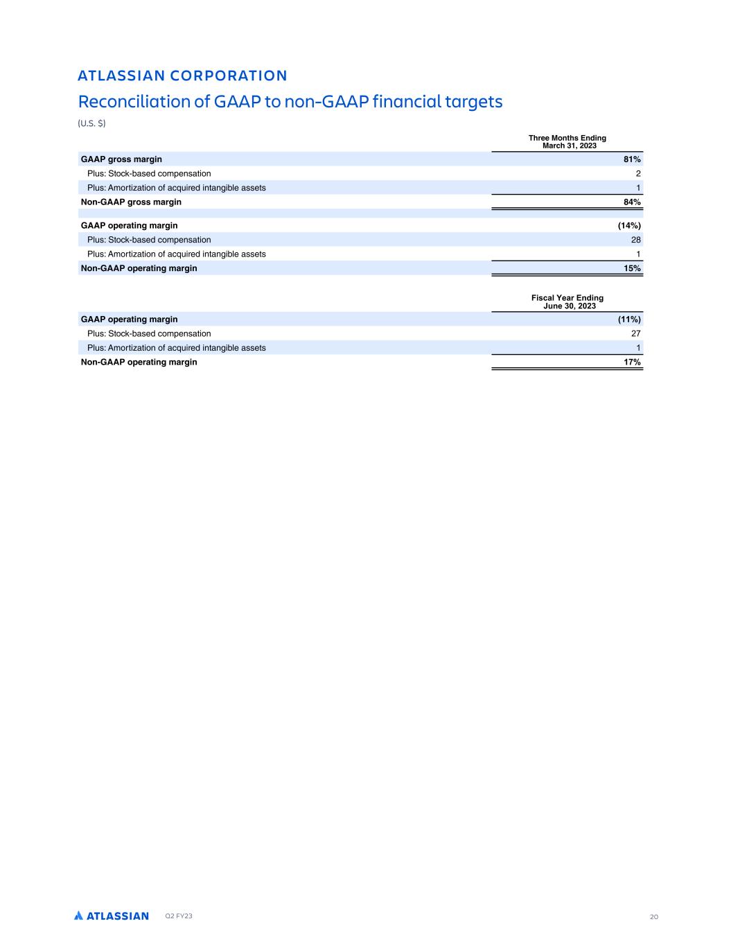 Q2 FY23 20 ATLASSIAN CORPORATION Reconciliation of GAAP to non-GAAP financial targets (U.S. $) FOCC L QFP 0 G E OAF ( '%'( 2-- EOLPP J OEG L S0 TOD $CBSFE DOMPFNSBT ON ( L S0 1MORT BT ON OG BD RFE NTBN CLF BSSFTS L 2-- EOLPP J OEG ) 2-- LMCO QG E J OEG ) L S0 TOD $CBSFE DOMPFNSBT ON (. L S0 1MORT BT ON OG BD RFE NTBN CLF BSSFTS L 2-- LMCO QG E J OEG , F E 2-- LMCO QG E J OEG %% L S0 TOD $CBSFE DOMPFNSBT ON  L S0 1MORT BT ON OG BD RFE NTBN CLF BSSFTS  L 2-- LMCO QG E J OEG %(