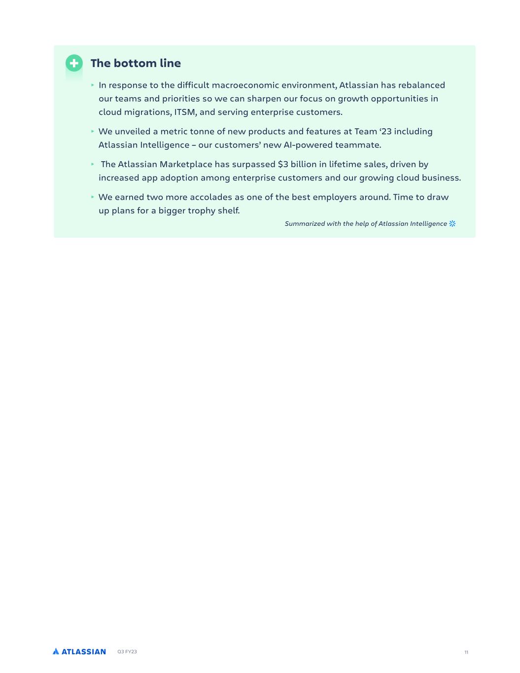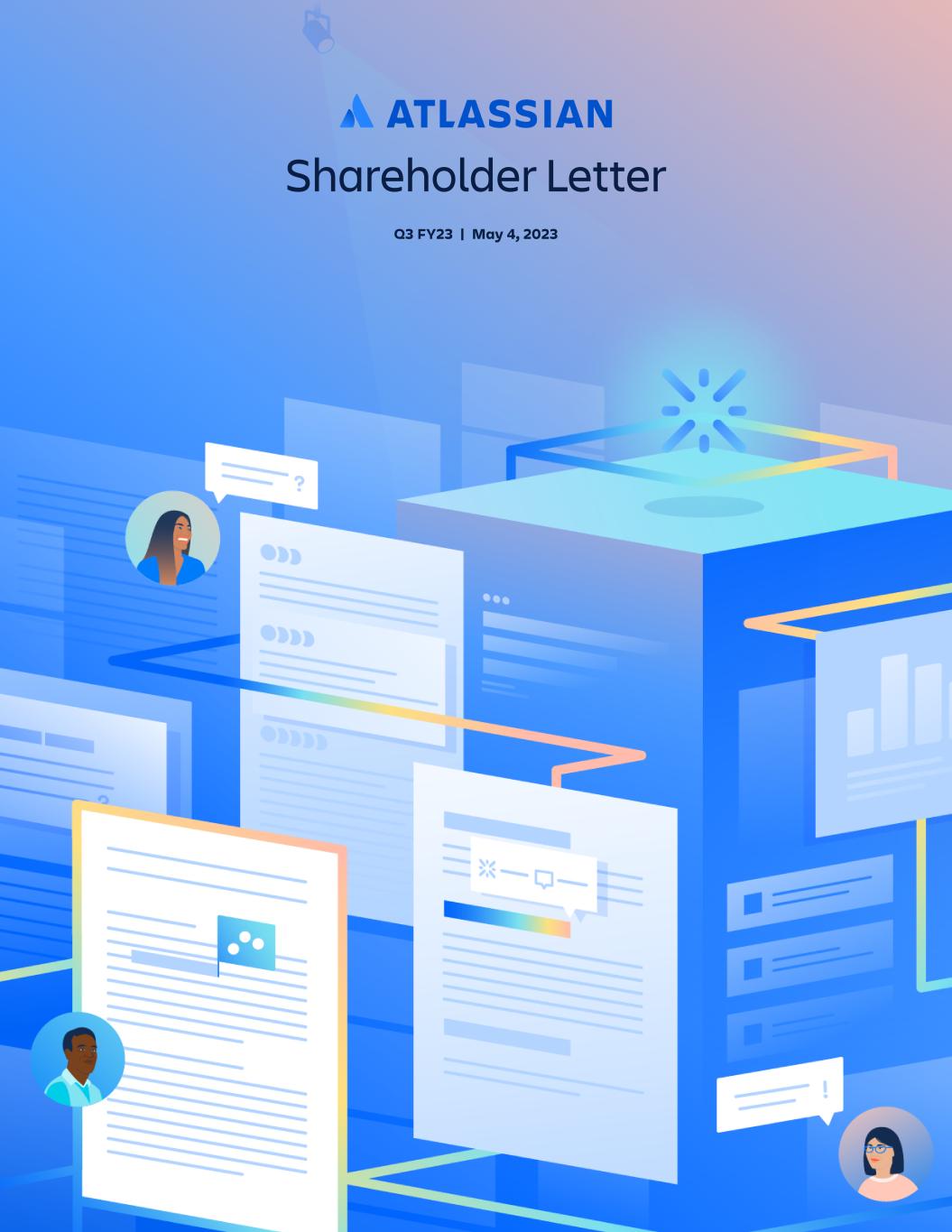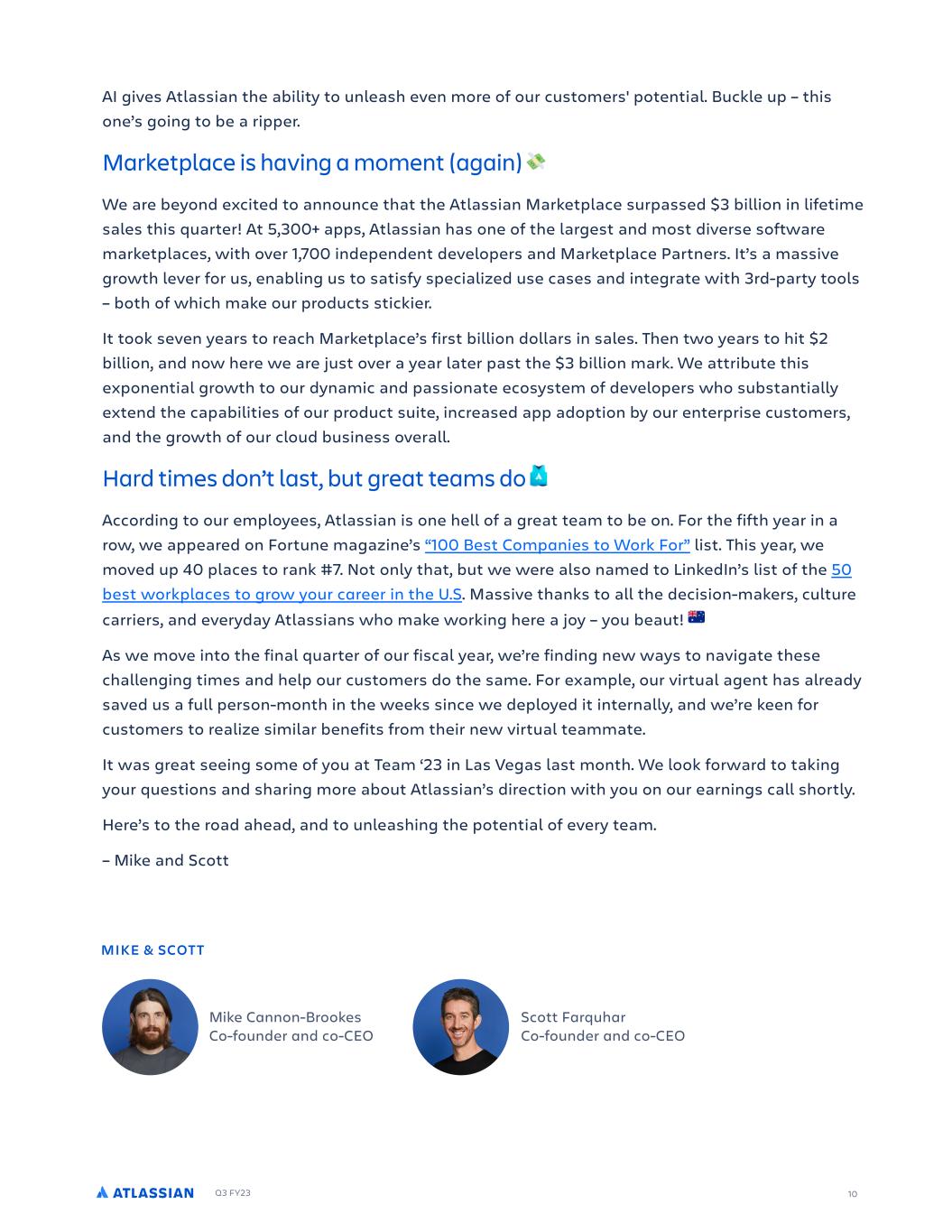 Q3 FY23 10 AI gives Atlassian the ability to unleash even more of our customers' potential. Buckle up – this one’s going to be a ripper. Marketplace is having a moment (again) We are beyond excited to announce that the Atlassian Marketplace surpassed $3 billion in lifetime sales this quarter! At 5,300+ apps, Atlassian has one of the largest and most diverse software marketplaces, with over 1,700 independent developers and Marketplace Partners. It’s a massive growth lever for us, enabling us to satisfy specialized use cases and integrate with 3rd-party tools – both of which make our products stickier. It took seven years to reach Marketplace’s first billion dollars in sales. Then two years to hit $2 billion, and now here we are just over a year later past the $3 billion mark. We attribute this exponential growth to our dynamic and passionate ecosystem of developers who substantially extend the capabilities of our product suite, increased app adoption by our enterprise customers, and the growth of our cloud business overall. Hard times don’t last, but great teams do According to our employees, Atlassian is one hell of a great team to be on. For the fifth year in a row, we appeared on Fortune magazine’s “100 Best Companies to Work For” list. This year, we moved up 40 places to rank #7. Not only that, but we were also named to LinkedIn’s list of the 50 best workplaces to grow your career in the U.S. Massive thanks to all the decision-makers, culture carriers, and everyday Atlassians who make working here a joy – you beaut! As we move into the final quarter of our fiscal year, we’re finding new ways to navigate these challenging times and help our customers do the same. For example, our virtual agent has already saved us a full person-month in the weeks since we deployed it internally, and we’re keen for customers to realize similar benefits from their new virtual teammate. It was great seeing some of you at Team ‘23 in Las Vegas last month. We look forward to taking your questions and sharing more about Atlassian’s direction with you on our earnings call shortly. Here’s to the road ahead, and to unleashing the potential of every team. – Mike and Scott Mike Cannon-Brookes Co-founder and co-CEO Scott Farquhar Co-founder and co-CEO MIKE & SCOT T