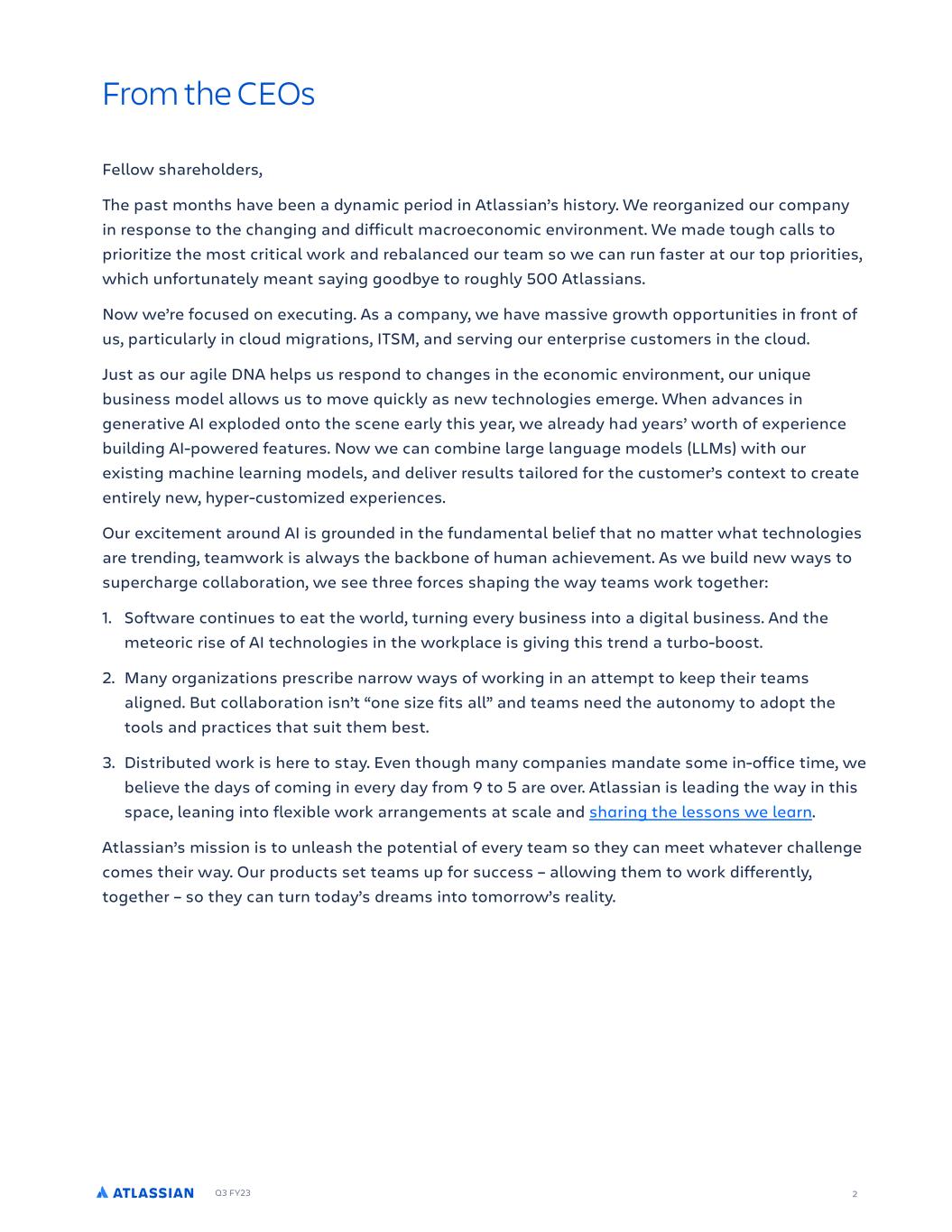 Q3 FY23 2 From the CEOs Fellow shareholders, The past months have been a dynamic period in Atlassian’s history. We reorganized our company in response to the changing and difficult macroeconomic environment. We made tough calls to prioritize the most critical work and rebalanced our team so we can run faster at our top priorities, which unfortunately meant saying goodbye to roughly 500 Atlassians. Now we’re focused on executing. As a company, we have massive growth opportunities in front of us, particularly in cloud migrations, ITSM, and serving our enterprise customers in the cloud. Just as our agile DNA helps us respond to changes in the economic environment, our unique business model allows us to move quickly as new technologies emerge. When advances in generative AI exploded onto the scene early this year, we already had years’ worth of experience building AI-powered features. Now we can combine large language models (LLMs) with our existing machine learning models, and deliver results tailored for the customer’s context to create entirely new, hyper-customized experiences. Our excitement around AI is grounded in the fundamental belief that no matter what technologies are trending, teamwork is always the backbone of human achievement. As we build new ways to supercharge collaboration, we see three forces shaping the way teams work together: 1. Software continues to eat the world, turning every business into a digital business. And the meteoric rise of AI technologies in the workplace is giving this trend a turbo-boost. 2. Many organizations prescribe narrow ways of working in an attempt to keep their teams aligned. But collaboration isn’t “one size fits all” and teams need the autonomy to adopt the tools and practices that suit them best. 3. Distributed work is here to stay. Even though many companies mandate some in-office time, we believe the days of coming in every day from 9 to 5 are over. Atlassian is leading the way in this space, leaning into flexible work arrangements at scale and sharing the lessons we learn. Atlassian’s mission is to unleash the potential of every team so they can meet whatever challenge comes their way. Our products set teams up for success – allowing them to work differently, together – so they can turn today’s dreams into tomorrow’s reality.