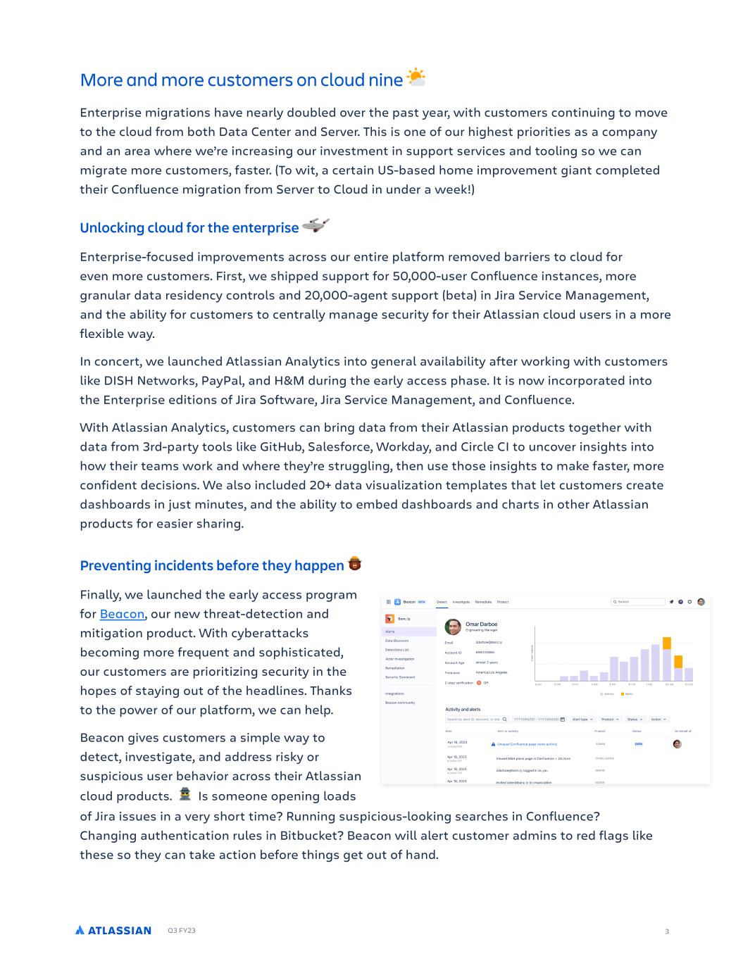Q3 FY23 3 More and more customers on cloud nine Enterprise migrations have nearly doubled over the past year, with customers continuing to move to the cloud from both Data Center and Server. This is one of our highest priorities as a company and an area where we’re increasing our investment in support services and tooling so we can migrate more customers, faster. (To wit, a certain US-based home improvement giant completed their Confluence migration from Server to Cloud in under a week!) Unlocking cloud for the enterprise Enterprise-focused improvements across our entire platform removed barriers to cloud for even more customers. First, we shipped support for 50,000-user Confluence instances, more granular data residency controls and 20,000-agent support (beta) in Jira Service Management, and the ability for customers to centrally manage security for their Atlassian cloud users in a more flexible way. In concert, we launched Atlassian Analytics into general availability after working with customers like DISH Networks, PayPal, and H&M during the early access phase. It is now incorporated into the Enterprise editions of Jira Software, Jira Service Management, and Confluence. With Atlassian Analytics, customers can bring data from their Atlassian products together with data from 3rd-party tools like GitHub, Salesforce, Workday, and Circle CI to uncover insights into how their teams work and where they’re struggling, then use those insights to make faster, more confident decisions. We also included 20+ data visualization templates that let customers create dashboards in just minutes, and the ability to embed dashboards and charts in other Atlassian products for easier sharing. of Jira issues in a very short time? Running suspicious-looking searches in Confluence? Changing authentication rules in Bitbucket? Beacon will alert customer admins to red flags like these so they can take action before things get out of hand. Preventing incidents before they happen Finally, we launched the early access program for Beacon, our new threat-detection and mitigation product. With cyberattacks becoming more frequent and sophisticated, our customers are prioritizing security in the hopes of staying out of the headlines. Thanks to the power of our platform, we can help. Beacon gives customers a simple way to detect, investigate, and address risky or suspicious user behavior across their Atlassian cloud products. Is someone opening loads