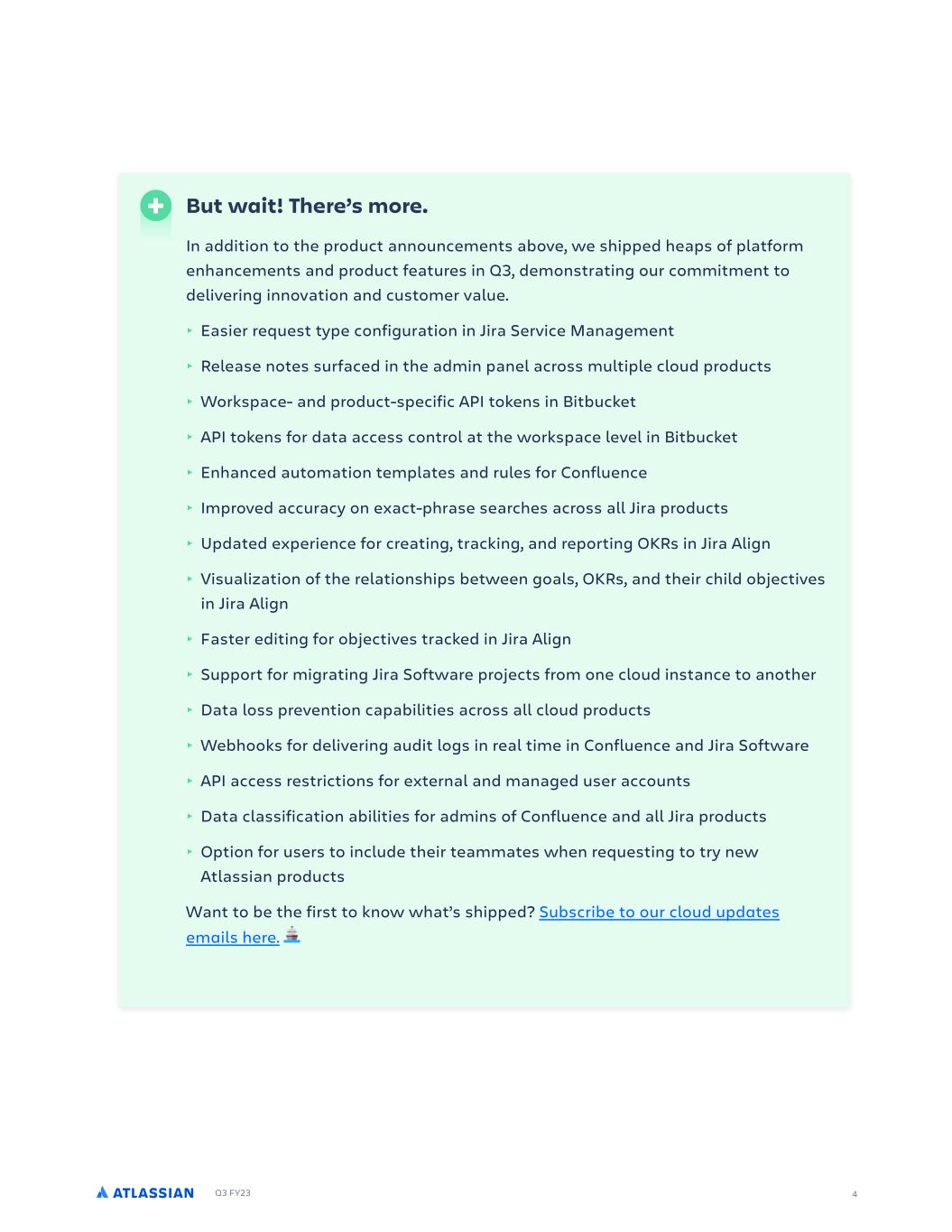 Q3 FY23 4 But wait! There’s more. In addition to the product announcements above, we shipped heaps of platform enhancements and product features in Q3, demonstrating our commitment to delivering innovation and customer value. ‣ Easier request type configuration in Jira Service Management ‣ Release notes surfaced in the admin panel across multiple cloud products ‣ Workspace- and product-specific API tokens in Bitbucket ‣ API tokens for data access control at the workspace level in Bitbucket ‣ Enhanced automation templates and rules for Confluence ‣ Improved accuracy on exact-phrase searches across all Jira products ‣ Updated experience for creating, tracking, and reporting OKRs in Jira Align ‣ Visualization of the relationships between goals, OKRs, and their child objectives in Jira Align ‣ Faster editing for objectives tracked in Jira Align ‣ Support for migrating Jira Software projects from one cloud instance to another ‣ Data loss prevention capabilities across all cloud products ‣ Webhooks for delivering audit logs in real time in Confluence and Jira Software ‣ API access restrictions for external and managed user accounts ‣ Data classification abilities for admins of Confluence and all Jira products ‣ Option for users to include their teammates when requesting to try new Atlassian products Want to be the first to know what’s shipped? Subscribe to our cloud updates emails here.