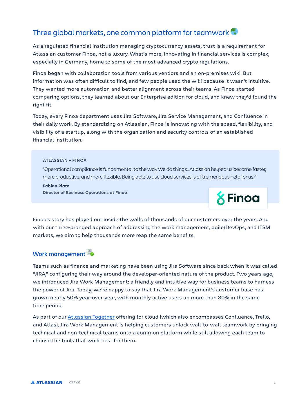 Q3 FY23 5 Three global markets, one common platform for teamwork As a regulated financial institution managing cryptocurrency assets, trust is a requirement for Atlassian customer Finoa, not a luxury. What’s more, innovating in financial services is complex, especially in Germany, home to some of the most advanced crypto regulations. Finoa began with collaboration tools from various vendors and an on-premises wiki. But information was often difficult to find, and few people used the wiki because it wasn’t intuitive. They wanted more automation and better alignment across their teams. As Finoa started comparing options, they learned about our Enterprise edition for cloud, and knew they’d found the right fit. Today, every Finoa department uses Jira Software, Jira Service Management, and Confluence in their daily work. By standardizing on Atlassian, Finoa is innovating with the speed, flexibility, and visibility of a startup, along with the organization and security controls of an established financial institution. Finoa’s story has played out inside the walls of thousands of our customers over the years. And with our three-pronged approach of addressing the work management, agile/DevOps, and ITSM markets, we aim to help thousands more reap the same benefits. Work management Teams such as finance and marketing have been using Jira Software since back when it was called “JIRA,” configuring their way around the developer-oriented nature of the product. Two years ago, we introduced Jira Work Management: a friendly and intuitive way for business teams to harness the power of Jira. Today, we’re happy to say that Jira Work Management’s customer base has grown nearly 50% year-over-year, with monthly active users up more than 80% in the same time period. As part of our Atlassian Together offering for cloud (which also encompasses Confluence, Trello, and Atlas), Jira Work Management is helping customers unlock wall-to-wall teamwork by bringing technical and non-technical teams onto a common platform while still allowing each team to choose the tools that work best for them. ATLASSIAN + FINOA “Operational compliance is fundamental to the way we do things…Atlassian helped us become faster, more productive, and more flexible. Being able to use cloud services is of tremendous help for us.” Fabian Plato Director of Business Operations at Finoa
