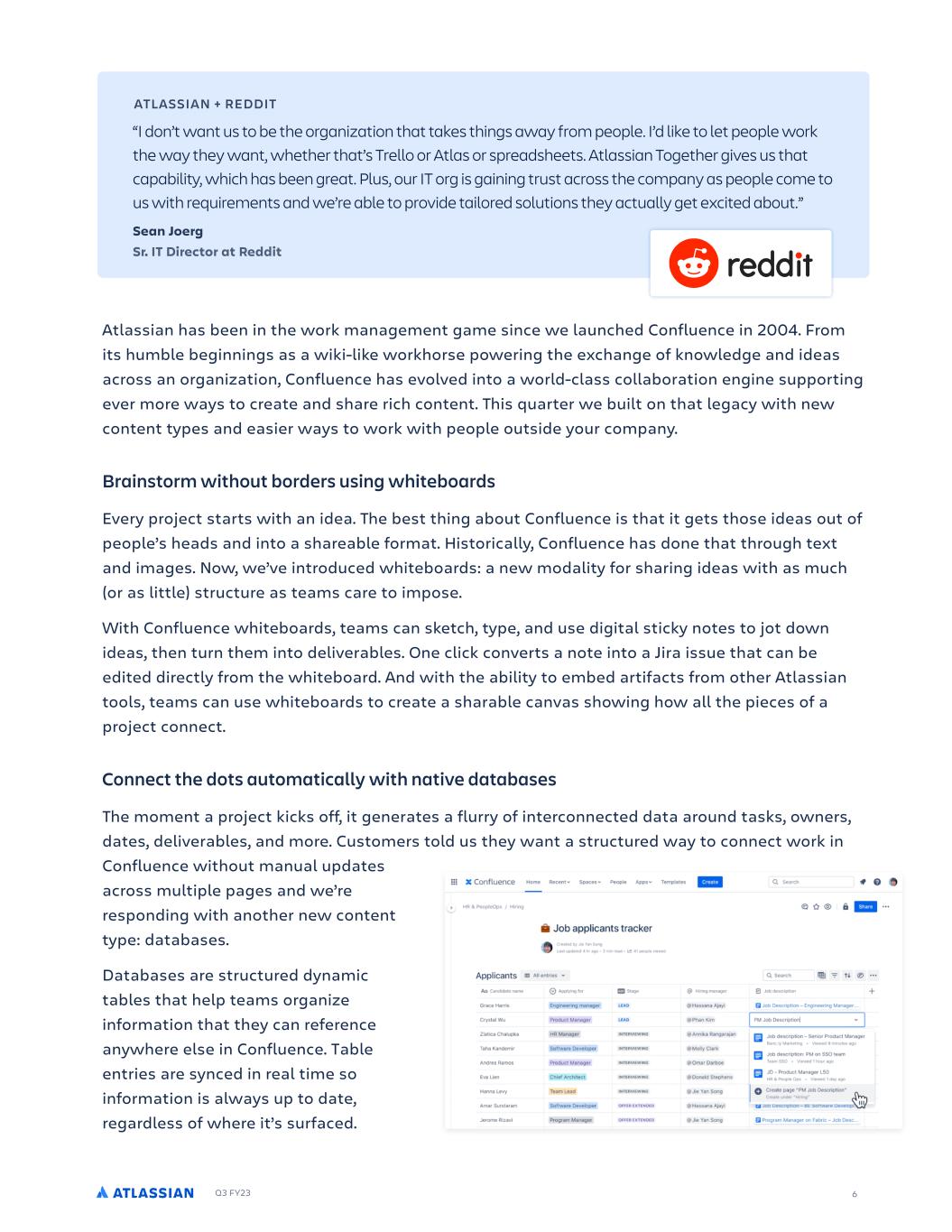 Q3 FY23 6 Atlassian has been in the work management game since we launched Confluence in 2004. From its humble beginnings as a wiki-like workhorse powering the exchange of knowledge and ideas across an organization, Confluence has evolved into a world-class collaboration engine supporting ever more ways to create and share rich content. This quarter we built on that legacy with new content types and easier ways to work with people outside your company. Brainstorm without borders using whiteboards Every project starts with an idea. The best thing about Confluence is that it gets those ideas out of people’s heads and into a shareable format. Historically, Confluence has done that through text and images. Now, we’ve introduced whiteboards: a new modality for sharing ideas with as much (or as little) structure as teams care to impose. With Confluence whiteboards, teams can sketch, type, and use digital sticky notes to jot down ideas, then turn them into deliverables. One click converts a note into a Jira issue that can be edited directly from the whiteboard. And with the ability to embed artifacts from other Atlassian tools, teams can use whiteboards to create a sharable canvas showing how all the pieces of a project connect. Connect the dots automatically with native databases The moment a project kicks off, it generates a flurry of interconnected data around tasks, owners, dates, deliverables, and more. Customers told us they want a structured way to connect work in Confluence without manual updates across multiple pages and we’re responding with another new content type: databases. Databases are structured dynamic tables that help teams organize information that they can reference anywhere else in Confluence. Table entries are synced in real time so information is always up to date, regardless of where it’s surfaced. ATLASSIAN + REDDIT “I don’t want us to be the organization that takes things away from people. I’d like to let people work the way they want, whether that’s Trello or Atlas or spreadsheets. Atlassian Together gives us that capability, which has been great. Plus, our IT org is gaining trust across the company as people come to us with requirements and we’re able to provide tailored solutions they actually get excited about.” Sean Joerg Sr. IT Director at Reddit