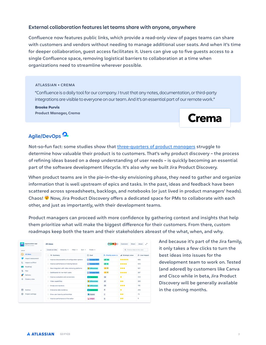 Q3 FY23 7 External collaboration features let teams share with anyone, anywhere Confluence now features public links, which provide a read-only view of pages teams can share with customers and vendors without needing to manage additional user seats. And when it’s time for deeper collaboration, guest access facilitates it. Users can give up to five guests access to a single Confluence space, removing logistical barriers to collaboration at a time when organizations need to streamline wherever possible. Agile/DevOps Not-so-fun fact: some studies show that three-quarters of product managers struggle to determine how valuable their product is to customers. That’s why product discovery – the process of refining ideas based on a deep understanding of user needs – is quickly becoming an essential part of the software development lifecycle. It’s also why we built Jira Product Discovery. When product teams are in the pie-in-the-sky envisioning phase, they need to gather and organize information that is well upstream of epics and tasks. In the past, ideas and feedback have been scattered across spreadsheets, backlogs, and notebooks (or just lived in product managers' heads). Chaos! Now, Jira Product Discovery offers a dedicated space for PMs to collaborate with each other, and just as importantly, with their development teams. Product managers can proceed with more confidence by gathering context and insights that help them prioritize what will make the biggest difference for their customers. From there, custom roadmaps keep both the team and their stakeholders abreast of the what, when, and why. And because it’s part of the Jira family, it only takes a few clicks to turn the best ideas into issues for the development team to work on. Tested (and adored) by customers like Canva and Cisco while in beta, Jira Product Discovery will be generally available in the coming months. ATLASSIAN + CREMA “Confluence is a daily tool for our company. I trust that any notes, documentation, or third-party integrations are visible to everyone on our team. And it’s an essential part of our remote work.” Brooke Purvis Product Manager, Crema