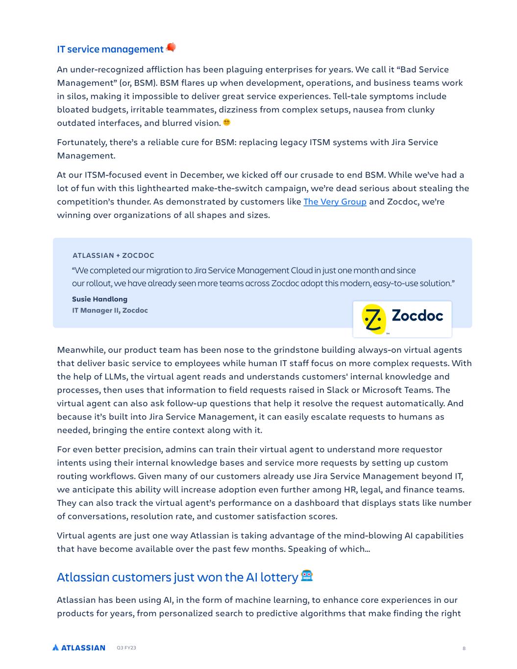 Q3 FY23 8 IT service management An under-recognized affliction has been plaguing enterprises for years. We call it “Bad Service Management” (or, BSM). BSM flares up when development, operations, and business teams work in silos, making it impossible to deliver great service experiences. Tell-tale symptoms include bloated budgets, irritable teammates, dizziness from complex setups, nausea from clunky outdated interfaces, and blurred vision. Fortunately, there’s a reliable cure for BSM: replacing legacy ITSM systems with Jira Service Management. At our ITSM-focused event in December, we kicked off our crusade to end BSM. While we’ve had a lot of fun with this lighthearted make-the-switch campaign, we’re dead serious about stealing the competition’s thunder. As demonstrated by customers like The Very Group and Zocdoc, we’re winning over organizations of all shapes and sizes. Meanwhile, our product team has been nose to the grindstone building always-on virtual agents that deliver basic service to employees while human IT staff focus on more complex requests. With the help of LLMs, the virtual agent reads and understands customers' internal knowledge and processes, then uses that information to field requests raised in Slack or Microsoft Teams. The virtual agent can also ask follow-up questions that help it resolve the request automatically. And because it’s built into Jira Service Management, it can easily escalate requests to humans as needed, bringing the entire context along with it. For even better precision, admins can train their virtual agent to understand more requestor intents using their internal knowledge bases and service more requests by setting up custom routing workflows. Given many of our customers already use Jira Service Management beyond IT, we anticipate this ability will increase adoption even further among HR, legal, and finance teams. They can also track the virtual agent’s performance on a dashboard that displays stats like number of conversations, resolution rate, and customer satisfaction scores. Virtual agents are just one way Atlassian is taking advantage of the mind-blowing AI capabilities that have become available over the past few months. Speaking of which… Atlassian customers just won the AI lottery Atlassian has been using AI, in the form of machine learning, to enhance core experiences in our products for years, from personalized search to predictive algorithms that make finding the right ATLASSIAN + ZOCDOC “We completed our migration to Jira Service Management Cloud in just one month and since our rollout, we have already seen more teams across Zocdoc adopt this modern, easy-to-use solution.” Susie Handlong IT Manager II, Zocdoc