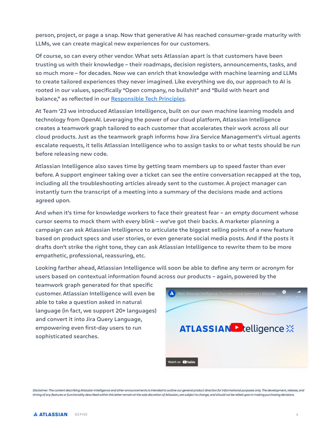 Q3 FY23 9 person, project, or page a snap. Now that generative AI has reached consumer-grade maturity with LLMs, we can create magical new experiences for our customers. Of course, so can every other vendor. What sets Atlassian apart is that customers have been trusting us with their knowledge – their roadmaps, decision registers, announcements, tasks, and so much more – for decades. Now we can enrich that knowledge with machine learning and LLMs to create tailored experiences they never imagined. Like everything we do, our approach to AI is rooted in our values, specifically “Open company, no bullshit” and “Build with heart and balance,” as reflected in our Responsible Tech Principles. At Team ‘23 we introduced Atlassian Intelligence, built on our own machine learning models and technology from OpenAI. Leveraging the power of our cloud platform, Atlassian Intelligence creates a teamwork graph tailored to each customer that accelerates their work across all our cloud products. Just as the teamwork graph informs how Jira Service Management’s virtual agents escalate requests, it tells Atlassian Intelligence who to assign tasks to or what tests should be run before releasing new code. Atlassian Intelligence also saves time by getting team members up to speed faster than ever before. A support engineer taking over a ticket can see the entire conversation recapped at the top, including all the troubleshooting articles already sent to the customer. A project manager can instantly turn the transcript of a meeting into a summary of the decisions made and actions agreed upon. And when it’s time for knowledge workers to face their greatest fear – an empty document whose cursor seems to mock them with every blink – we’ve got their backs. A marketer planning a campaign can ask Atlassian Intelligence to articulate the biggest selling points of a new feature based on product specs and user stories, or even generate social media posts. And if the posts it drafts don’t strike the right tone, they can ask Atlassian Intelligence to rewrite them to be more empathetic, professional, reassuring, etc. Looking farther ahead, Atlassian Intelligence will soon be able to define any term or acronym for users based on contextual information found across our products – again, powered by the teamwork graph generated for that specific customer. Atlassian Intelligence will even be able to take a question asked in natural language (in fact, we support 20+ languages) and convert it into Jira Query Language, empowering even first-day users to run sophisticated searches. Disclaimer: The content describing Atlassian Intelligence and other announcements is intended to outline our general product direction for informational purposes only. The development, release, and timing of any features or functionality described within this letter remain at the sole discretion of Atlassian, are subject to change, and should not be relied upon in making purchasing decisions.