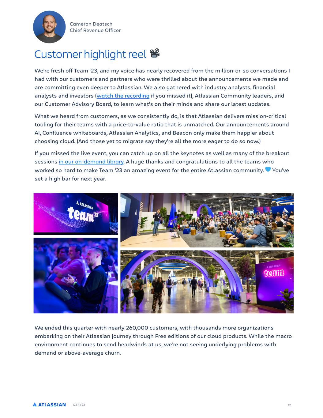 Q3 FY23 We’re fresh off Team ‘23, and my voice has nearly recovered from the million-or-so conversations I had with our customers and partners who were thrilled about the announcements we made and are committing even deeper to Atlassian. We also gathered with industry analysts, financial analysts and investors (watch the recording if you missed it), Atlassian Community leaders, and our Customer Advisory Board, to learn what’s on their minds and share our latest updates. What we heard from customers, as we consistently do, is that Atlassian delivers mission-critical tooling for their teams with a price-to-value ratio that is unmatched. Our announcements around AI, Confluence whiteboards, Atlassian Analytics, and Beacon only make them happier about choosing cloud. (And those yet to migrate say they’re all the more eager to do so now.) If you missed the live event, you can catch up on all the keynotes as well as many of the breakout sessions in our on-demand library. A huge thanks and congratulations to all the teams who worked so hard to make Team ‘23 an amazing event for the entire Atlassian community. You’ve set a high bar for next year. We ended this quarter with nearly 260,000 customers, with thousands more organizations embarking on their Atlassian journey through Free editions of our cloud products. While the macro environment continues to send headwinds at us, we’re not seeing underlying problems with demand or above-average churn. 12 Customer highlight reel Cameron Deatsch Chief Revenue Officer