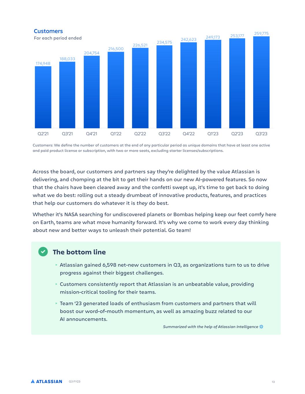Q3 FY23 13 Customers: We define the number of customers at the end of any particular period as unique domains that have at least one active and paid product license or subscription, with two or more seats, excluding starter licenses/subscriptions. Across the board, our customers and partners say they’re delighted by the value Atlassian is delivering, and chomping at the bit to get their hands on our new AI-powered features. So now that the chairs have been cleared away and the confetti swept up, it’s time to get back to doing what we do best: rolling out a steady drumbeat of innovative products, features, and practices that help our customers do whatever it is they do best. Whether it’s NASA searching for undiscovered planets or Bombas helping keep our feet comfy here on Earth, teams are what move humanity forward. It’s why we come to work every day thinking about new and better ways to unleash their potential. Go team! Q2’21 Q3’21 Q4’21 Q1’22 Q2’22 Q3’22 Q4’22 Q1’23 Q2’23 Q3’23 259,775253,177249,173242,623 234,575 226,521 216,500 204,754 188,033 174,948 For each period ended Customers The bottom line ‣ Atlassian gained 6,598 net-new customers in Q3, as organizations turn to us to drive progress against their biggest challenges. ‣ Customers consistently report that Atlassian is an unbeatable value, providing mission-critical tooling for their teams. ‣ Team ‘23 generated loads of enthusiasm from customers and partners that will boost our word-of-mouth momentum, as well as amazing buzz related to our AI announcements. Summarized with the help of Atlassian Intelligence
