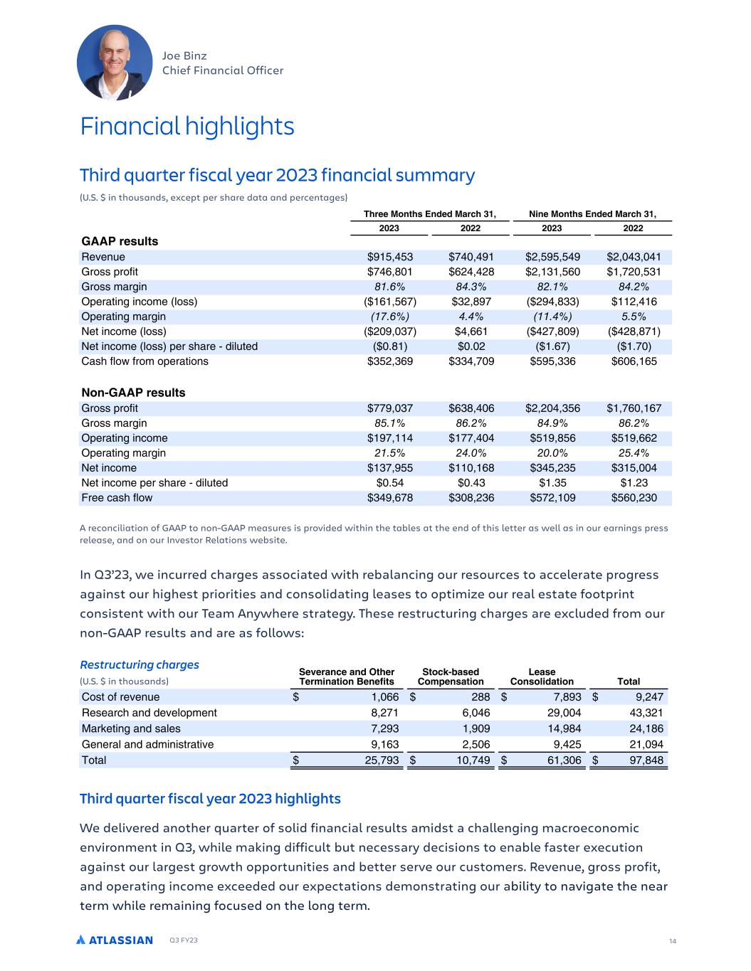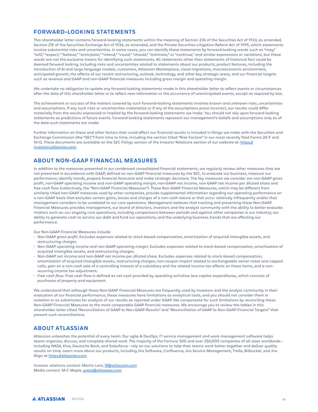Q3 FY23 26 FORWARD-LOOKING STATEMENTS This shareholder letter contains forward-looking statements within the meaning of Section 27A of the Securities Act of 1933, as amended, Section 21E of the Securities Exchange Act of 1934, as amended, and the Private Securities Litigation Reform Act of 1995, which statements involve substantial risks and uncertainties. In some cases, you can identify these statements by forward-looking words such as “may,” “will,” “expect,” “believe,” “anticipate,” “intend,” “could,” “should,” “estimate,” or “continue,” and similar expressions or variations, but these words are not the exclusive means for identifying such statements. All statements other than statements of historical fact could be deemed forward looking, including risks and uncertainties related to statements about our products, product features, including the introduction of AI and large language models, customers, Atlassian Marketplace, cloud migrations, macroeconomic environment, anticipated growth, the effects of our recent restructuring, outlook, technology, and other key strategic areas, and our financial targets such as revenue and GAAP and non-GAAP financial measures including gross margin and operating margin. We undertake no obligation to update any forward-looking statements made in this shareholder letter to reflect events or circumstances after the date of this shareholder letter or to reflect new information or the occurrence of unanticipated events, except as required by law. The achievement or success of the matters covered by such forward-looking statements involves known and unknown risks, uncertainties and assumptions. If any such risks or uncertainties materialize or if any of the assumptions prove incorrect, our results could differ materially from the results expressed or implied by the forward-looking statements we make. You should not rely upon forward-looking statements as predictions of future events. Forward-looking statements represent our management’s beliefs and assumptions only as of the date such statements are made. Further information on these and other factors that could affect our financial results is included in filings we make with the Securities and Exchange Commission (the “SEC”) from time to time, including the section titled “Risk Factors” in our most recently filed Forms 20-F and 10-Q. These documents are available on the SEC Filings section of the Investor Relations section of our website at: https:// investors.atlassian.com. ABOUT NON-GAAP FINANCIAL MEASURES In addition to the measures presented in our condensed consolidated financial statements, we regularly review other measures that are not presented in accordance with GAAP, defined as non-GAAP financial measures by the SEC, to evaluate our business, measure our performance, identify trends, prepare financial forecasts and make strategic decisions. The key measures we consider are non-GAAP gross profit, non-GAAP operating income and non-GAAP operating margin, non-GAAP net income, non-GAAP net income per diluted share and free cash flow (collectively, the “Non-GAAP Financial Measures”). These Non-GAAP Financial Measures, which may be different from similarly titled non-GAAP measures used by other companies, provide supplemental information regarding our operating performance on a non-GAAP basis that excludes certain gains, losses and charges of a non-cash nature or that occur relatively infrequently and/or that management considers to be unrelated to our core operations. Management believes that tracking and presenting these Non-GAAP Financial Measures provides management, our board of directors, investors and the analyst community with the ability to better evaluate matters such as: our ongoing core operations, including comparisons between periods and against other companies in our industry; our ability to generate cash to service our debt and fund our operations; and the underlying business trends that are affecting our performance. Our Non-GAAP Financial Measures include: • Non-GAAP gross profit. Excludes expenses related to stock-based compensation, amortization of acquired intangible assets, and restructuring charges. • Non-GAAP operating income and non-GAAP operating margin. Excludes expenses related to stock-based compensation, amortization of acquired intangible assets, and restructuring charges. • Non-GAAP net income and non-GAAP net income per diluted share. Excludes expenses related to stock-based compensation, amortization of acquired intangible assets, restructuring charges, non-coupon impact related to exchangeable senior notes and capped calls, gain on a non-cash sale of a controlling interest of a subsidiary and the related income tax effects on these items, and a non- recurring income tax adjustment. • Free cash flow. Free cash flow is defined as net cash provided by operating activities less capital expenditures, which consists of purchases of property and equipment. We understand that although these Non-GAAP Financial Measures are frequently used by investors and the analyst community in their evaluation of our financial performance, these measures have limitations as analytical tools, and you should not consider them in isolation or as substitutes for analysis of our results as reported under GAAP. We compensate for such limitations by reconciling these Non-GAAP Financial Measures to the most comparable GAAP financial measures. We encourage you to review the tables in this shareholder letter titled “Reconciliation of GAAP to Non-GAAP Results” and “Reconciliation of GAAP to Non-GAAP Financial Targets” that present such reconciliations. ABOUT ATLASSIAN Atlassian unleashes the potential of every team. Our agile & DevOps, IT service management and work management software helps teams organize, discuss, and complete shared work. The majority of the Fortune 500 and over 250,000 companies of all sizes worldwide - includin