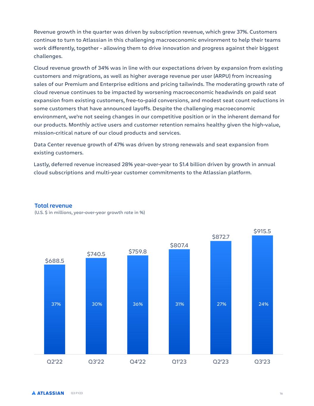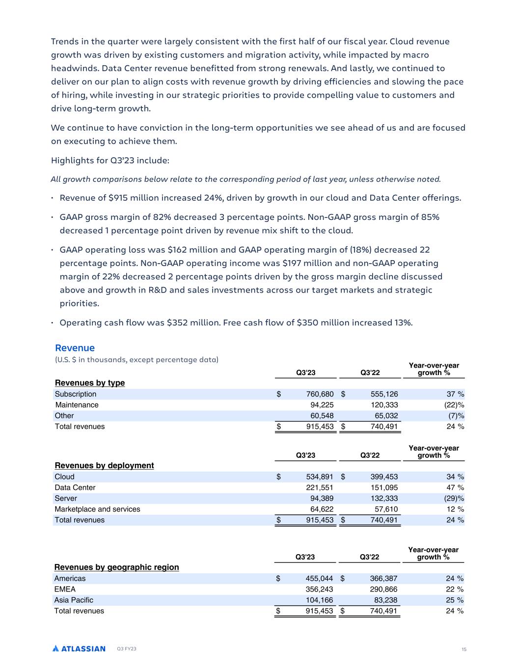 Q3 FY23 15 Trends in the quarter were largely consistent with the first half of our fiscal year. Cloud revenue growth was driven by existing customers and migration activity, while impacted by macro headwinds. Data Center revenue benefitted from strong renewals. And lastly, we continued to deliver on our plan to align costs with revenue growth by driving efficiencies and slowing the pace of hiring, while investing in our strategic priorities to provide compelling value to customers and drive long-term growth. We continue to have conviction in the long-term opportunities we see ahead of us and are focused on executing to achieve them. Highlights for Q3’23 include: All growth comparisons below relate to the corresponding period of last year, unless otherwise noted. • Revenue of $915 million increased 24%, driven by growth in our cloud and Data Center offerings. • GAAP gross margin of 82% decreased 3 percentage points. Non-GAAP gross margin of 85% decreased 1 percentage point driven by revenue mix shift to the cloud. • GAAP operating loss was $162 million and GAAP operating margin of (18%) decreased 22 percentage points. Non-GAAP operating income was $197 million and non-GAAP operating margin of 22% decreased 2 percentage points driven by the gross margin decline discussed above and growth in R&D and sales investments across our target markets and strategic priorities. • Operating cash flow was $352 million. Free cash flow of $350 million increased 13%. (U.S. $ in thousands, except percentage data) Revenue JKSF R CS GS PH HKTECM )') SGWGO G SGT M T TY S LYO % PcNP P NPY LRP ) )) BGCS%PWGS% GCS ISP J GWGO GT D QG G M N T T Y 0/)%/1) ...% +/ ,0 ALTY PYLYNP 2-%++. +)%,,, ++ C SP /)%.-1 /.%),+ 0 LW PaPY P 2 .%-., 0-)%-2 +- ) )) BGCS%PWGS% GCS ISP J GWGO GT D FGQMP NGO 8W O .,-%12 ,22%-., ,- 9L L 8PY P ++ %.. . %)2. -0 GP aP 2-%,12 ,+%,,, +2 AL VP WLNP LYO P aTNP /-%/++ .0%/ ) + LW PaPY P 2 .%-., 0-)%-2 +- ) )) BGCS%PWGS% GCS ISP J GWGO GT D IGPISCQJKE SGIKPO 6 P TNL -..%)-- ,//%,10 +- :A:6 ,./%+-, +2)%1// ++ 6 TL DLNTQTN )-% // 1,%+,1 +. LW PaPY P 2 .%-., 0-)%-2 +-