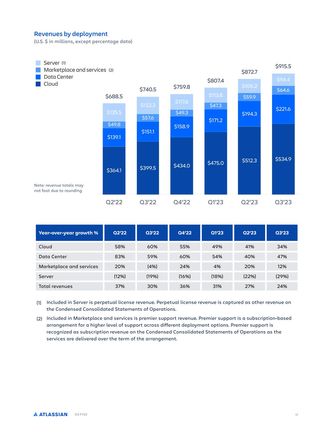 Q3 FY23 17 Year-over-year growth % Q2’22 Q3’22 Q4’22 Q1’23 Q2’23 Q3’23 Cloud 58% 60% 55% 49% 41% 34% Data Center 83% 59% 60% 54% 40% 47% Marketplace and services 20% (4%) 24% 4% 20% 12% Server (12%) (19%) (16%) (18%) (22%) (29%) Total revenues 37% 30% 36% 31% 27% 24% Included in Server is perpetual license revenue. Perpetual license revenue is captured as other revenue on the Condensed Consolidated Statements of Operations. (1) Included in Marketplace and services is premier support revenue. Premier support is a subscription-based arrangement for a higher level of support across different deployment options. Premier support is recognized as subscription revenue on the Condensed Consolidated Statements of Operations as the services are delivered over the term of the arrangement. (2) (U.S. $ in millions, except percentage data) Revenues by deployment $915.5 $872.7 $807.4 $759.8$740.5 $688.5 Q2’22 Q3’22 Q4’22 Q1’23 Q2’23 Q3’23 $94.4 $106.2 $113.8 $117.6$132.3 $135.5 $64.6 $59.9 $47.3 $49.3 $57.6 $49.8 $221.6 $194.3 $171.2 $158.9 $151.1 $139.1 $534.9$512.3$475.0$434.0$399.5$364.1 Cloud Data Center Marketplace and services Server (2) (1) Note: revenue totals may not foot due to rounding