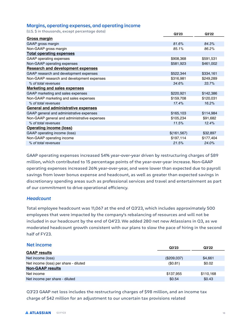 Q3 FY23 GAAP operating expenses increased 54% year-over-year driven by restructuring charges of $89 million, which contributed to 15 percentage points of the year-over-year increase. Non-GAAP operating expenses increased 26% year-over-year, and were lower than expected due to payroll savings from lower bonus expense and headcount, as well as greater than expected savings in discretionary spending areas such as professional services and travel and entertainment as part of our commitment to drive operational efficiency. Headcount Total employee headcount was 11,067 at the end of Q3’23, which includes approximately 500 employees that were impacted by the company’s rebalancing of resources and will not be included in our headcount by the end of Q4’23. We added 280 net new Atlassians in Q3, as we moderated headcount growth consistent with our plans to slow the pace of hiring in the second half of FY23. Net income Q3’23 GAAP net loss includes the restructuring charges of $98 million, and an income tax charge of $42 million for an adjustment to our uncertain tax provisions related JKSF R CS GS PH HKTECM )') :G OEPNG TY S LYO % PcNP P SL P OL L ) )) 3-- SGT M T BP TYN P W +)2%),0 -%// BP TYN P W P SL P & OTW PO ) 1 ) )+ :PO%3-- SGT M T BP TYN P ,0%2.. )% /1 BP TYN P P SL P & OTW PO ) .- ) -, JKSF R CS GS PH HKTECM )') 2SGG /CTJ 2MP TY S LYO % PcNP P NPY LRP ) )) 2SGG ECTJ HMP 66D YP NL S aTOPO Md P L TYR LN TaT TP ,.+%,/2 ,,-%0)2 @P 3 8L T LW Pc PYOT P +%/2 +/%-0, 6SFF DBTI GMP ,-2%/01 ,)1%+,/ F F6 AG ).%( %, JKSF R CS GS PH HKTECM )') NCSIKOT COF PQGSC KOI GYQGOTG T NNCS TY S LYO % PcNP P SL P OL L LYO P NPY LRP ) )) 3SPTT NCSIKO f f 66D R L RTY . %, . %) B Y& 66D R L RTY . % .,%( P CM PQGSC KOI GYQGOTGT 66D P L TYR Pc PY P 2)1%,/1 .2 %., B Y& 66D P L TYR Pc PY P .1 %2+, -/ %))+ GTGCSEJ COF FGWGMPQNGO GYQGOTGT 66D P PL NS LYO OPaPW PY Pc PY P .++%,-- ,,-% / B Y& 66D P PL NS LYO OPaPW PY Pc PY P , /%21 +-2%+12 F F6 AG ) %, ))%- CSLG KOI COF TCMGT GYQGOTGT 66D L VP TYR LYO LWP Pc PY P ++)%2+ -+%,1/ B Y& 66D L VP TYR LYO LWP Pc PY P .2%0)1 +)%), F F6 AG -% ,%( 3GOGSCM COF CFNKOKT SC KWG GYQGOTGT 66D RPYP LW LYO LO TYT L TaP Pc PY P /.% ), -%21- B Y& 66D RPYP LW LYO LO TYT L TaP Pc PY P ).%+,- 2 %/1+ F F6 AG % (% QGSC KOI KOEPNG MPTT 66D P L TYR TYN P W / %./0 ,+%120 B Y& 66D P L TYR TYN P 20% - 00%-)- F F6 AG ( % ( % ) 18 (U.S. $ in thousands, except percentage data) Margins, operating expenses, and operating income