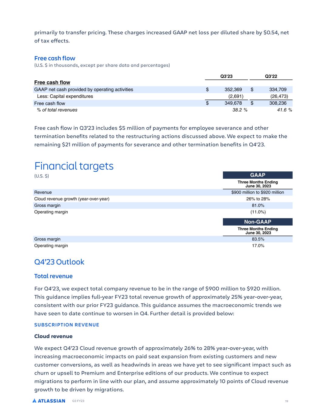 Q3 FY23 19 primarily to transfer pricing. These charges increased GAAP net loss per diluted share by $0.54, net of tax effects. Free cash flow (U.S. $ in thousands, except per share data and percentages) Free cash flow in Q3’23 includes $5 million of payments for employee severance and other termination benefits related to the restructuring actions discussed above. We expect to make the remaining $21 million of payments for severance and other termination benefits in Q4'23. Financial targets (U.S. $) Q4’23 Outlook Total revenue For Q4’23, we expect total company revenue to be in the range of $900 million to $920 million. This guidance implies full-year FY23 total revenue growth of approximately 25% year-over-year, consistent with our prior FY23 guidance. This guidance assumes the macroeconomic trends we have seen to date continue to worsen in Q4. Further detail is provided below: SUBSCRIPTION REVENUE Cloud revenue We expect Q4’23 Cloud revenue growth of approximately 26% to 28% year-over-year, with increasing macroeconomic impacts on paid seat expansion from existing customers and new customer conversions, as well as headwinds in areas we have yet to see significant impact such as churn or upsell to Premium and Enterprise editions of our products. We continue to expect migrations to perform in line with our plan, and assume approximately 10 points of Cloud revenue growth to be driven by migrations. 2KOCOEKCM CSIG T  3-- JSGG PO JT 1OFKOI OG '$ )') FPaPY P 2)) TWWT Y 2+) TWWT Y 8W O PaPY P R b S dPL & aP &dPL +/ +1 L RTY 1 ) C P L TYR L RTY ) :PO%3-- JSGG PO JT 1OFKOI OG '$ )') L RTY 1, . C P L TYR L RTY 0 ) JKSF R CS GS PH HKTECM )') :G OEPNG TY S LYO % PcNP P SL P OL L ) )) 3-- SGT M T BP TYN P W +)2%),0 -%// BP TYN P W P SL P & OTW PO ) 1 ) )+ :PO%3-- SGT M T BP TYN P ,0%2.. )% /1 BP TYN P P SL P & OTW PO ) .- ) -, JKSF R CS GS PH HKTECM )') 2SGG /CTJ 2MP TY S LYO % PcNP P NPY LRP ) )) 2SGG ECTJ HMP 66D YP NL S aTOPO Md P L TYR LN TaT TP ,.+%,/2 ,,-%0)2 @P 3 8L T LW Pc PYOT P +%/2 +/%-0, 6SFF DBTI GMP ,-2%/01 ,)1%+,/ F F6 AG ).%( %,