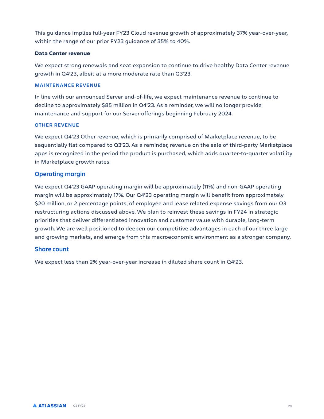 Q3 FY23 20 This guidance implies full-year FY23 Cloud revenue growth of approximately 37% year-over-year, within the range of our prior FY23 guidance of 35% to 40%. Data Center revenue We expect strong renewals and seat expansion to continue to drive healthy Data Center revenue growth in Q4’23, albeit at a more moderate rate than Q3’23. MAINTENANCE REVENUE In line with our announced Server end-of-life, we expect maintenance revenue to continue to decline to approximately $85 million in Q4’23. As a reminder, we will no longer provide maintenance and support for our Server offerings beginning February 2024. OTHER REVENUE We expect Q4'23 Other revenue, which is primarily comprised of Marketplace revenue, to be sequentially flat compared to Q3’23. As a reminder, revenue on the sale of third-party Marketplace apps is recognized in the period the product is purchased, which adds quarter-to-quarter volatility in Marketplace growth rates. Operating margin We expect Q4’23 GAAP operating margin will be approximately (11%) and non-GAAP operating margin will be approximately 17%. Our Q4’23 operating margin will benefit from approximately $20 million, or 2 percentage points, of employee and lease related expense savings from our Q3 restructuring actions discussed above. We plan to reinvest these savings in FY24 in strategic priorities that deliver differentiated innovation and customer value with durable, long-term growth. We are well positioned to deepen our competitive advantages in each of our three large and growing markets, and emerge from this macroeconomic environment as a stronger company. Share count We expect less than 2% year-over-year increase in diluted share count in Q4’23.