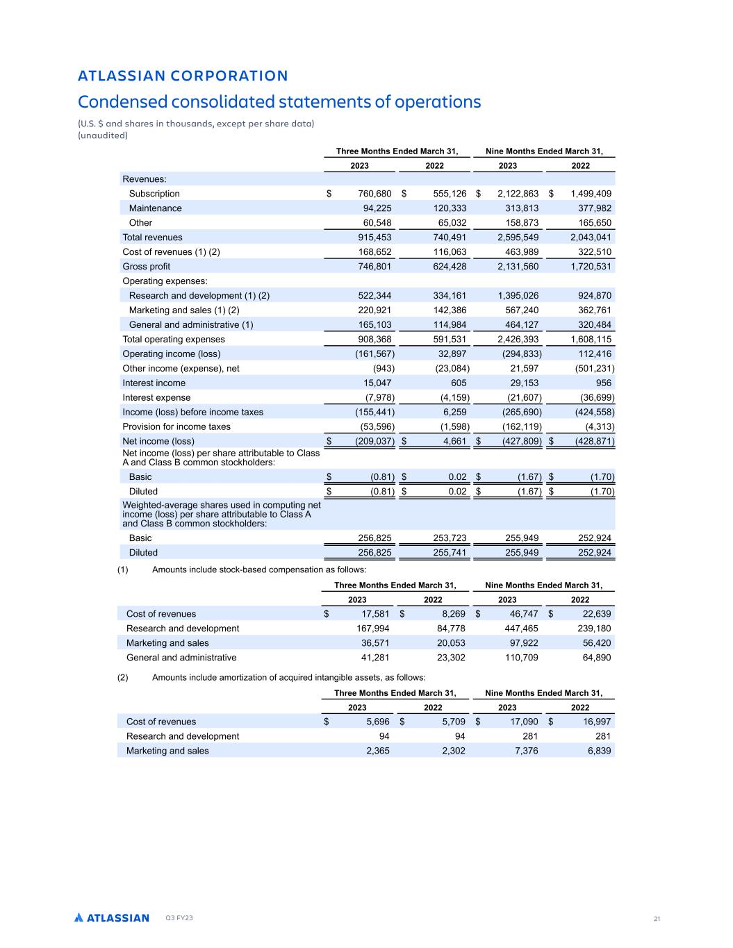 Q3 FY23 21 .RJ L 0MPNMP R ML 0MLCDL DC 0ML MJ C RDC R RD DLR ME NDP R ML % % LC G PD L RGMS LC D BDNR NDP G PD C R SL SC RDC  GPDD 7MLRG 2LCDC 7 PBG ) 8 LD 7MLRG 2LCDC 7 PBG ) ( () ( (( ( () ( (( FWFO FT0 CTDS PO -, ,. (, ( (( .,) :B O FOBODF (( ( ))) ) ) . ) )-- .( IFS , . , )( . .-) , , P BM SFWFO FT ) - ( ( ) 3PT PG SFWFO FT ( ,. , ( , ,) ,) . )(( 7SPTT SPG - , . ,( (. ( ) , -( ) FSB O F FOTFT0 FTFBSDI BOE EFWFMP NFO ( (( ) )) , ) (, ( .- :BSLF O BOE TBMFT ( (( ( ( )., ,- ( ),( -, 7FOFSBM BOE BEN O T SB WF , ) . , (- )( . P BM P FSB O F FOTFT . ),. ) ( (, ) ) , . FSB O ODPNF MPTT , ,- )( . - ( .)) ( , IFS ODPNF F FOTF OF ) () . ( - () 8O FSFT ODPNF - , ( ) , 8O FSFT F FOTF - -. ( , - ), , 8ODPNF MPTT CFGPSF ODPNF B FT , ( (, , ( . SPW T PO GPS ODPNF B FT ) , . ,( ) ) F ODPNF MPTT ( )- ,, (- . (. .- F ODPNF MPTT FS TIBSF B S C BCMF P 3MBTT 1 BOE 3MBTT 2 DPNNPO T PDLIPMEFST0 2BT D %. % ( %,- %- 4 M FE %. % ( %,- %- AF I FE$BWFSB F TIBSFT TFE O DPN O OF ODPNF MPTT FS TIBSF B S C BCMF P 3MBTT 1 BOE 3MBTT 2 DPNNPO T PDLIPMEFST0 2BT D ( , .( ( ) -() ( ( ( ( 4 M FE ( , .( ( - ( ( ( ( 1NP O T ODM EF T PDL$CBTFE DPN FOTB PO BT GPMMP T0 GPDD 7MLRG 2LCDC 7 PBG ) 8 LD 7MLRG 2LCDC 7 PBG ) ( () ( (( ( () ( (( 3PT PG SFWFO FT - . . (, , - - (( ,) FTFBSDI BOE EFWFMP NFO ,- . --. - , () . :BSLF O BOE TBMFT ), - ( ) - (( , ( 7FOFSBM BOE BEN O T SB WF (. () ) ( - , . ( 1NP O T ODM EF BNPS B PO PG BDR SFE O BO CMF BTTF T BT GPMMP T0 GPDD 7MLRG 2LCDC 7 PBG ) 8 LD 7MLRG 2LCDC 7 PBG ) ( () ( (( ( () ( (( 3PT PG SFWFO FT , , - - , - FTFBSDI BOE EFWFMP NFO (. (. :BSLF O BOE TBMFT ( ), ( ) ( - )-, , .) ATLASSIAN CORPORATION Condensed consolidated statements of operations (U.S. $ and shares in thousands, except per share data) (unaudited)