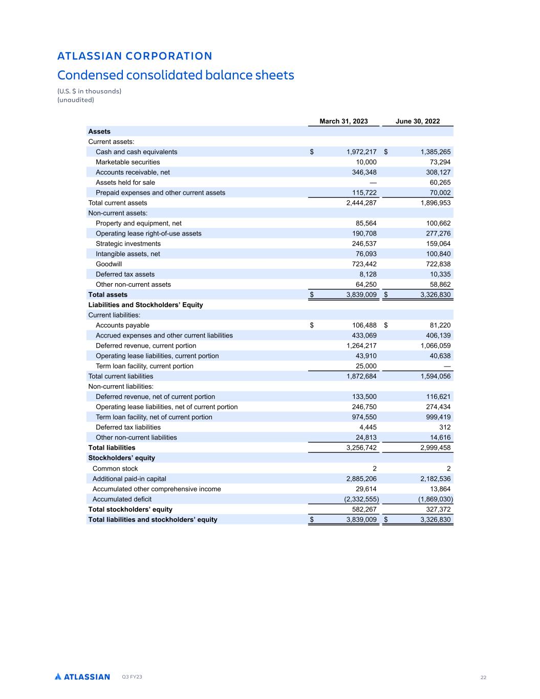 Q3 FY23 22 .RJ L 0MPNMP R ML 0MLCDL DC 0ML MJ C RDC J LBD GDDR % % L RGMS LC SL SC RDC 7 PBG ) ( () 5SLD ) ( (( . DR 3 SSFO BTTF T0 3BTI BOE DBTI FR WBMFO T -( ( - ). (, :BSLF BCMF TFD S FT -) ( 1DDP O T SFDF WBCMF OF ) , ) . ) . (- 1TTF T IFME GPS TBMF , (, SF B E F FOTFT BOE P IFS D SSFO BTTF T -(( - ( P BM D SSFO BTTF T ( (.- . , ) PO$D SSFO BTTF T0 SP FS BOE FR NFO OF . , ,,( FSB O MFBTF S I $PG$ TF BTTF T - . (-- (-, SB F D OWFT NFO T ( , )- , 8O BO CMF BTTF T OF -, ) . 7PPE MM -() ( -(( .). 4FGFSSFE B BTTF T . (. )) IFS OPO$D SSFO BTTF T , ( . .,( MR J DR ) .) ) )(, .) A J R D LC RMB GMJCDP 2OS RW 3 SSFO M BC M FT0 1DDP O T B BCMF , .. . (( 1DDS FE F FOTFT BOE P IFS D SSFO M BC M FT )) , , ) 4FGFSSFE SFWFO F D SSFO PS PO (, ( - ,, FSB O MFBTF M BC M FT D SSFO PS PO ) ,). FSN MPBO GBD M D SSFO PS PO ( P BM D SSFO M BC M FT .-( ,. , PO$D SSFO M BC M FT0 4FGFSSFE SFWFO F OF PG D SSFO PS PO )) , ,( FSB O MFBTF M BC M FT OF PG D SSFO PS PO ( , - (- ) FSN MPBO GBD M OF PG D SSFO PS PO - 4FGFSSFE B M BC M FT ) ( IFS OPO$D SSFO M BC M FT ( . ) , , MR J J A J R D ) ( , - ( ( . RMB GMJCDP DOS RW 3PNNPO T PDL ( ( 1EE POBM B E$ O DB BM ( .. ( , ( .( ), 1DD N MB FE P IFS DPN SFIFOT WF ODPNF ( , ) ., 1DD N MB FE EFG D ( ))( ., ) MR J RMB GMJCDP DOS RW .( (,- )(- )-( MR J J A J R D LC RMB GMJCDP DOS RW ) .) ) )(, .) , ATLASSIAN CORPORATION Condensed consolidated balance sheets (U.S. $ in thousands) (unaudited)