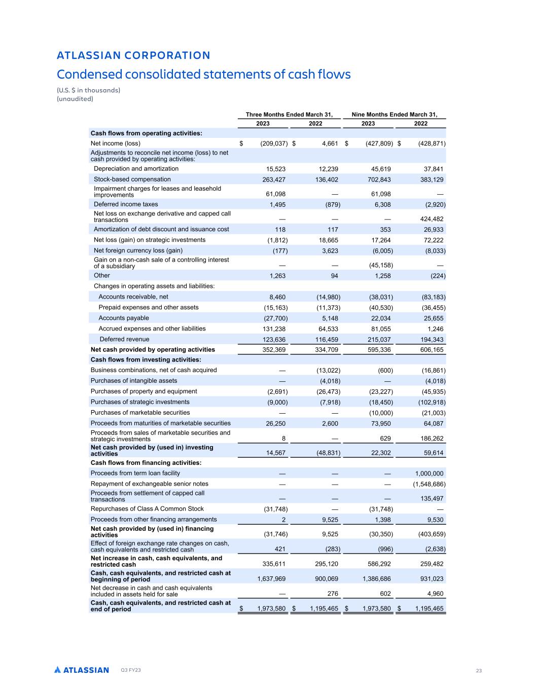 Q3 FY23 23 .RJ L 0MPNMP R ML 0MLCDL DC 0ML MJ C RDC R RD DLR ME 0 G 3JMU % % L RGMS LC SL SC RDC          GPDD 7MLRG 2LCDC 7 PBG ) 8 LD 7MLRG 2LCDC 7 PBG ) ( () ( (( ( () ( (( 0 G EJMU EPM MNDP R LF BR T R D - F ODPNF MPTT ( )- ,, (- . (. .- 1E T NFO T P SFDPOD MF OF ODPNF MPTT P OF DBTI SPW EFE C P FSB O BD W FT0 4F SFD B PO BOE BNPS B PO () ( () , )- . PDL$CBTFE DPN FOTB PO (,) (- ), ( - ( . ) ).) ( 8N B SNFO DIBS FT GPS MFBTFT BOE MFBTFIPME N SPWFNFO T , . , . 4FGFSSFE ODPNF B FT .- , ) . ( ( F MPTT PO F DIBO F EFS WB WF BOE DB FE DBMM SBOTBD POT ( .( 1NPS B PO PG EFC E TDP O BOE TT BODF DPT . - ) ) (, )) F MPTT B O PO T SB F D OWFT NFO T . ( . ,, - (, -( ((( F GPSF O D SSFOD MPTT B O -- ) ,() , . )) 7B O PO B OPO$DBTI TBMF PG B DPO SPMM O O FSFT PG B T CT E BS . IFS (,) ( . (( 3IBO FT O P FSB O BTTF T BOE M BC M FT0 1DDP O T SFDF WBCMF OF . , . ). ) .) .) SF B E F FOTFT BOE P IFS BTTF T ,) )-) ) ), 1DDP O T B BCMF (- - . (( ) ( , 1DDS FE F FOTFT BOE P IFS M BC M FT ) (). , )) . ( , 4FGFSSFE SFWFO F () ,), , ( )- ) ) 8DR B G NPMT CDC AW MNDP R LF BR T R D ) ( ), )) - )), , , , 0 G EJMU EPM LTD R LF BR T R D - 2 T OFTT DPNC OB POT OF PG DBTI BDR SFE ) (( , , ., SDIBTFT PG O BO CMF BTTF T . . SDIBTFT PG SP FS BOE FR NFO ( , (, -) () ((- ) SDIBTFT PG T SB F D OWFT NFO T - . . ( . SDIBTFT PG NBSLF BCMF TFD S FT ( ) SPDFFET GSPN NB S FT PG NBSLF BCMF TFD S FT (, ( ( , -) , .- SPDFFET GSPN TBMFT PG NBSLF BCMF TFD S FT BOE T SB F D OWFT NFO T . ,( ., (,( 8DR B G NPMT CDC AW S DC L LTD R LF BR T R D ,- . .) (( ) ( , 0 G EJMU EPM E L LB LF BR T R D - SPDFFET GSPN FSN MPBO GBD M F B NFO PG F DIBO FBCMF TFO PS OP FT . ,., SPDFFET GSPN TF MFNFO PG DB FE DBMM SBOTBD POT ) - F SDIBTFT PG 3MBTT 1 3PNNPO PDL ) - . ) - . SPDFFET GSPN P IFS G OBOD O BSSBO FNFO T ( ( ) . ) 8DR B G NPMT CDC AW S DC L E L LB LF BR T R D ) - , ( ) ) ) , 5GGFD PG GPSF O F DIBO F SB F DIBO FT PO DBTI DBTI FR WBMFO T BOE SFT S D FE DBTI ( (.) , ( ,). 8DR LBPD D L B G B G DOS T JDLR LC PD RP BRDC B G )) , ( ( ., ( ( ( .( 0 G B G DOS T JDLR LC PD RP BRDC B G R ADF LL LF ME NDP MC ,)- , , )., ,., ) () F EFDSFBTF O DBTI BOE DBTI FR WBMFO T ODM EFE O BTTF T IFME GPS TBMF (-, , ( , 0 G B G DOS T JDLR LC PD RP BRDC B G R DLC ME NDP MC -) . , -) . , - ATLASSIAN CORPORATION Condensed consolidated statements of cash flows (U.S. $ in thousands) (unaudited)