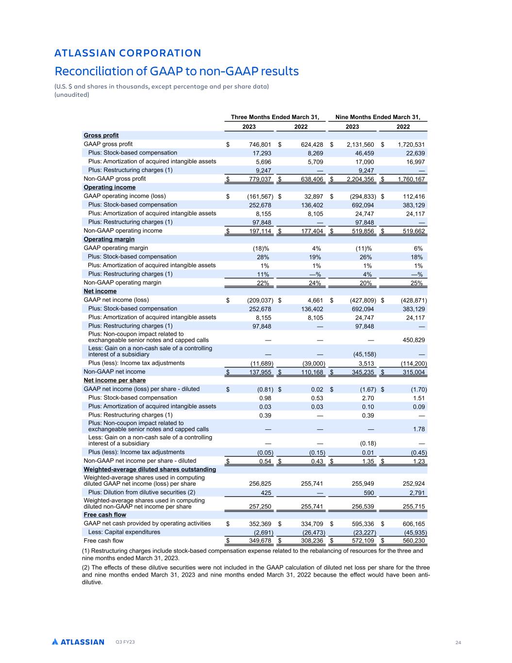 Q3 FY23 24 ATLASSIAN CORPORATION Reconciliation of GAAP to non-GAAP results (U.S. $ and shares in thousands, except percentage and per share data) (unaudited) .RJ L 0MPNMP R ML DBMLB J R ML ME ..: RM 8ML$ ..: D SJR % % LC G PD L RGMS LC D BDNR NDPBDLR FD LC NDP G PD C R SL SC RDC GPDD 7MLRG 2LCDC 7 PBG ) 8 LD 7MLRG 2LCDC 7 PBG ) ( () ( (( ( () ( (( PM NPME R 711 SPTT SPG - , . ,( (. ( ) , -( ) M T0 PDL$CBTFE DPN FOTB PO - ( ) . (, , (( ,) M T0 1NPS B PO PG BDR SFE O BO CMF BTTF T , , - - , - M T0 FT S D S O DIBS FT ( - ( - PO$711 SPTT SPG -- )- ,). , ( ( ) , -, ,- NDP R LF LBM D 711 P FSB O ODPNF MPTT , ,- )( . - ( .)) ( , M T0 PDL$CBTFE DPN FOTB PO ( ( ,-. ), ( , ( ).) ( M T0 1NPS B PO PG BDR SFE O BO CMF BTTF T . . ( - - ( - M T0 FT S D S O DIBS FT - . . - . . PO$711 P FSB O ODPNF - -- . , ,,( NDP R LF PF L 711 P FSB O NBS O . , M T0 PDL$CBTFE DPN FOTB PO (. (, . M T0 1NPS B PO PG BDR SFE O BO CMF BTTF T M T0 FT S D S O DIBS FT PO$711 P FSB O NBS O (( ( ( ( 8DR LBM D 711 OF ODPNF MPTT ( )- ,, (- . (. .- M T0 PDL$CBTFE DPN FOTB PO ( ( ,-. ), ( , ( ).) ( M T0 1NPS B PO PG BDR SFE O BO CMF BTTF T . . ( - - ( - M T0 FT S D S O DIBS FT - . . - . . M T0 PO$DP PO N BD SFMB FE P F DIBO FBCMF TFO PS OP FT BOE DB FE DBMMT .( 9FTT0 7B O PO B OPO$DBTI TBMF PG B DPO SPMM O O FSFT PG B T CT E BS . M T MFTT 0 8ODPNF B BE T NFO T ,. ) ) ) ( PO$711 OF ODPNF )- ,. ) () ) 8DR LBM D NDP G PD 711 OF ODPNF MPTT FS TIBSF $ E M FE %. % ( %,- %- M T0 PDL$CBTFE DPN FOTB PO % . % ) (%- % M T0 1NPS B PO PG BDR SFE O BO CMF BTTF T % ) % ) % % M T0 FT S D S O DIBS FT %) %) M T0 PO$DP PO N BD SFMB FE P F DIBO FBCMF TFO PS OP FT BOE DB FE DBMMT %-. 9FTT0 7B O PO B OPO$DBTI TBMF PG B DPO SPMM O O FSFT PG B T CT E BS % . M T MFTT 0 8ODPNF B BE T NFO T % % % % PO$711 OF ODPNF FS TIBSF $ E M FE % % ) %) %() D FGRDC$ TDP FD C JSRDC G PD MSR R LC LF AF I FE$BWFSB F TIBSFT TFE O DPN O E M FE 711 OF ODPNF MPTT FS TIBSF ( , .( ( - ( ( ( ( M T0 4 M PO GSPN E M WF TFD S FT ( ( ( - AF I FE$BWFSB F TIBSFT TFE O DPN O E M FE OPO$711 OF ODPNF FS TIBSF ( - ( ( - ( , ) ( - 3PDD B G EJMU 711 OF DBTI SPW EFE C P FSB O BD W FT ) ( ), )) - )), , , , 9FTT0 3B BM F FOE SFT ( , (, -) () ((- ) 6SFF DBTI GMP ) ,-. ) . (), -( , () FT S D S O DIBS FT ODM EF T PDL$CBTFE DPN FOTB PO F FOTF SFMB FE P IF SFCBMBOD O PG SFTP SDFT GPS IF ISFF BOE O OF NPO IT FOEFE :BSDI ) ( ()% ( IF FGGFD T PG IFTF E M WF TFD S FT FSF OP ODM EFE O IF 711 DBMD MB PO PG E M FE OF MPTT FS TIBSF GPS IF ISFF BOE O OF NPO IT FOEFE :BSDI ) ( () BOE O OF NPO IT FOEFE :BSDI ) ( (( CFDB TF IF FGGFD P ME IBWF CFFO BO $ E M WF%