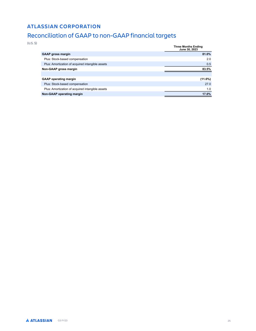 Q3 FY23 25 ATLASSIAN CORPORATION Reconciliation of GAAP to non-GAAP financial targets (U.S. $) .RJ L 0MPNMP R ML DBMLB J R ML ME ..: RM 8ML$ ..: 3 L LB J PFDR GPDD 7MLRG 2LC LF 5SLD ) ( () ..: FPM PF L , % M T0 PDL$CBTFE DPN FOTB PO (% M T0 1NPS B PO PG BDR SFE O BO CMF BTTF T % 8ML$ ..: FPM PF L ,)% ..: MNDP R LF PF L % M T0 PDL$CBTFE DPN FOTB PO (-% M T0 1NPS B PO PG BDR SFE O BO CMF BTTF T % 8ML$ ..: MNDP R LF PF L %