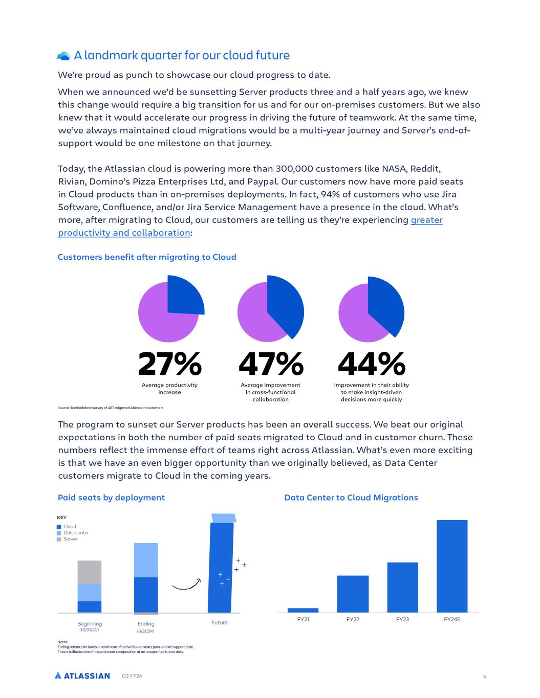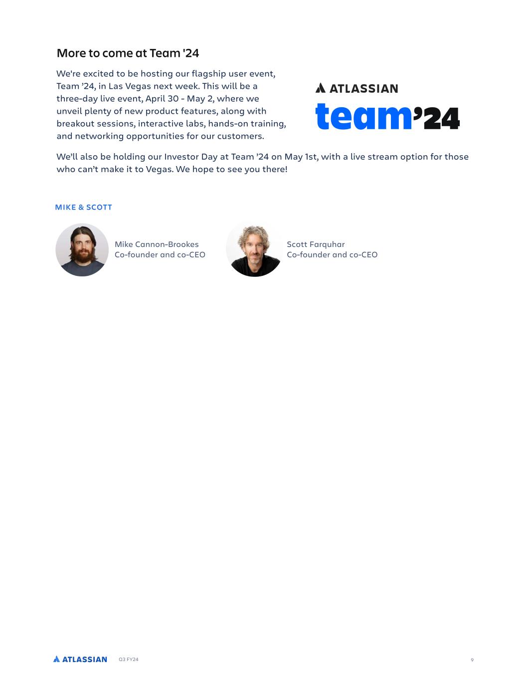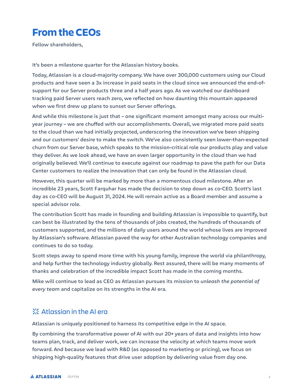 Q3 FY24 From the CEOs Fellow shareholders, It’s been a milestone quarter for the Atlassian history books. Today, Atlassian is a cloud-majority company. We have over 300,000 customers using our Cloud products and have seen a 3x increase in paid seats in the cloud since we announced the end-of- support for our Server products three and a half years ago. As we watched our dashboard tracking paid Server users reach zero, we reflected on how daunting this mountain appeared when we first drew up plans to sunset our Server offerings. And while this milestone is just that – one significant moment amongst many across our multi- year journey – we are chuffed with our accomplishments. Overall, we migrated more paid seats to the cloud than we had initially projected, underscoring the innovation we’ve been shipping and our customers' desire to make the switch. We’ve also consistently seen lower-than-expected churn from our Server base, which speaks to the mission-critical role our products play and value they deliver. As we look ahead, we have an even larger opportunity in the cloud than we had originally believed. We’ll continue to execute against our roadmap to pave the path for our Data Center customers to realize the innovation that can only be found in the Atlassian cloud. However, this quarter will be marked by more than a momentous cloud milestone. After an incredible 23 years, Scott Farquhar has made the decision to step down as co-CEO. Scott’s last day as co-CEO will be August 31, 2024. He will remain active as a Board member and assume a special advisor role. The contribution Scott has made in founding and building Atlassian is impossible to quantify, but can best be illustrated by the tens of thousands of jobs created, the hundreds of thousands of customers supported, and the millions of daily users around the world whose lives are improved by Atlassian’s software. Atlassian paved the way for other Australian technology companies and continues to do so today. Scott steps away to spend more time with his young family, improve the world via philanthropy, and help further the technology industry globally. Rest assured, there will be many moments of thanks and celebration of the incredible impact Scott has made in the coming months. Mike will continue to lead as CEO as Atlassian pursues its mission to unleash the potential of every team and capitalize on its strengths in the AI era. Atlassian in the AI era Atlassian is uniquely positioned to harness its competitive edge in the AI space. By combining the transformative power of AI with our 20+ years of data and insights into how teams plan, track, and deliver work, we can increase the velocity at which teams move work forward. And because we lead with R&D (as opposed to marketing or pricing), we focus on shipping high-quality features that drive user adoption by delivering value from day one. 2