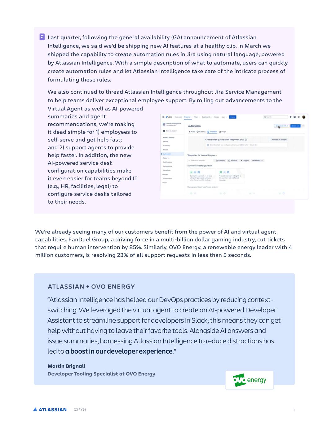 Q3 FY24 We’re already seeing many of our customers benefit from the power of AI and virtual agent capabilities. FanDuel Group, a driving force in a multi-billion dollar gaming industry, cut tickets that require human intervention by 85%. Similarly, OVO Energy, a renewable energy leader with 4 million customers, is resolving 23% of all support requests in less than 5 seconds. 3 Last quarter, following the general availability (GA) announcement of Atlassian Intelligence, we said we’d be shipping new AI features at a healthy clip. In March we shipped the capability to create automation rules in Jira using natural language, powered by Atlassian Intelligence. With a simple description of what to automate, users can quickly create automation rules and let Atlassian Intelligence take care of the intricate process of formulating these rules. We also continued to thread Atlassian Intelligence throughout Jira Service Management to help teams deliver exceptional employee support. By rolling out advancements to the ATLASSIAN + OVO ENERGY “Atlassian Intelligence has helped our DevOps practices by reducing context- switching. We leveraged the virtual agent to create an AI-powered Developer Assistant to streamline support for developers in Slack; this means they can get help without having to leave their favorite tools. Alongside AI answers and issue summaries, harnessing Atlassian Intelligence to reduce distractions has led to a boost in our developer experience.” Martin Brignall Developer Tooling Specialist at OVO Energy Virtual Agent as well as AI-powered summaries and agent recommendations, we’re making it dead simple for 1) employees to self-serve and get help fast; and 2) support agents to provide help faster. In addition, the new AI-powered service desk configuration capabilities make it even easier for teams beyond IT (e.g., HR, facilities, legal) to configure service desks tailored to their needs.