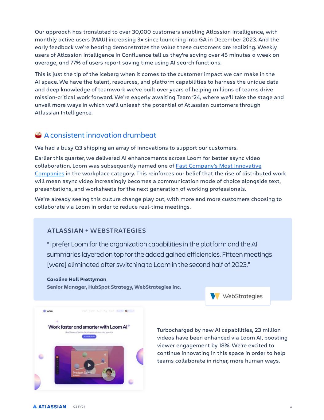 Q3 FY24 Our approach has translated to over 30,000 customers enabling Atlassian Intelligence, with monthly active users (MAU) increasing 3x since launching into GA in December 2023. And the early feedback we’re hearing demonstrates the value these customers are realizing. Weekly users of Atlassian Intelligence in Confluence tell us they’re saving over 45 minutes a week on average, and 77% of users report saving time using AI search functions. This is just the tip of the iceberg when it comes to the customer impact we can make in the AI space. We have the talent, resources, and platform capabilities to harness the unique data and deep knowledge of teamwork we’ve built over years of helping millions of teams drive mission-critical work forward. We’re eagerly awaiting Team ‘24, where we’ll take the stage and unveil more ways in which we’ll unleash the potential of Atlassian customers through Atlassian Intelligence. A consistent innovation drumbeat We had a busy Q3 shipping an array of innovations to support our customers. Earlier this quarter, we delivered AI enhancements across Loom for better async video collaboration. Loom was subsequently named one of Fast Company’s Most Innovative Companies in the workplace category. This reinforces our belief that the rise of distributed work will mean async video increasingly becomes a communication mode of choice alongside text, presentations, and worksheets for the next generation of working professionals. We’re already seeing this culture change play out, with more and more customers choosing to collaborate via Loom in order to reduce real-time meetings. 4 ATLASSIAN + WEBSTRATEGIES “I prefer Loom for the organization capabilities in the platform and the AI summaries layered on top for the added gained efficiencies. Fifteen meetings [were] eliminated after switching to Loom in the second half of 2023.” Caroline Hall Prettyman Senior Manager, HubSpot Strategy, WebStrategies inc. Turbocharged by new AI capabilities, 23 million videos have been enhanced via Loom AI, boosting viewer engagement by 18%. We’re excited to continue innovating in this space in order to help teams collaborate in richer, more human ways.