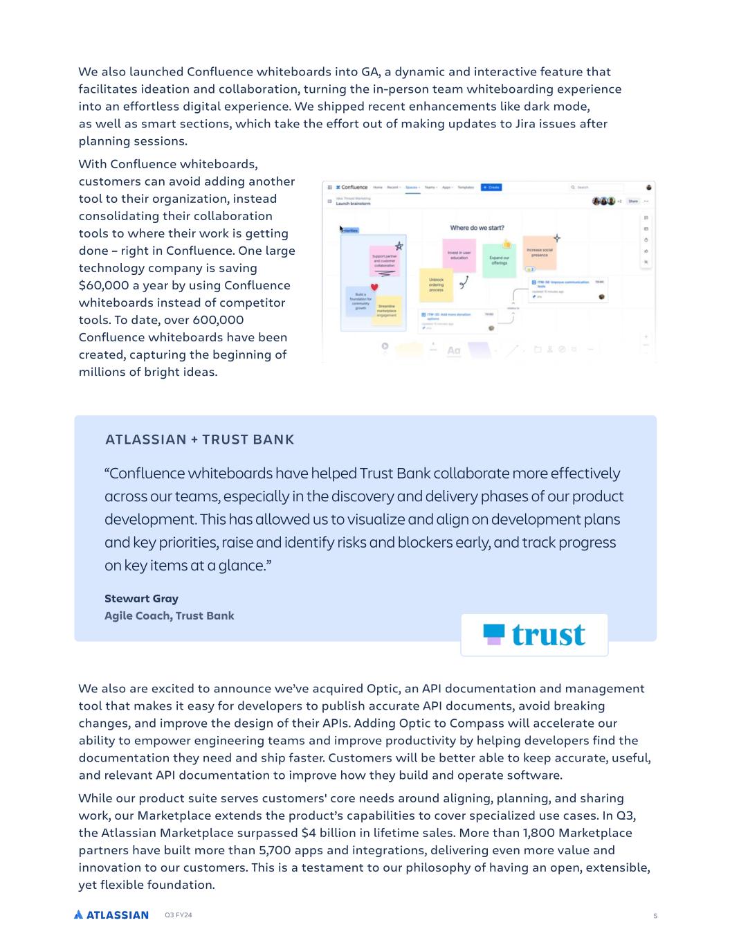 Q3 FY24 We also launched Confluence whiteboards into GA, a dynamic and interactive feature that facilitates ideation and collaboration, turning the in-person team whiteboarding experience into an effortless digital experience. We shipped recent enhancements like dark mode, as well as smart sections, which take the effort out of making updates to Jira issues after planning sessions. We also are excited to announce we’ve acquired Optic, an API documentation and management tool that makes it easy for developers to publish accurate API documents, avoid breaking changes, and improve the design of their APIs. Adding Optic to Compass will accelerate our ability to empower engineering teams and improve productivity by helping developers find the documentation they need and ship faster. Customers will be better able to keep accurate, useful, and relevant API documentation to improve how they build and operate software. While our product suite serves customers' core needs around aligning, planning, and sharing work, our Marketplace extends the product’s capabilities to cover specialized use cases. In Q3, the Atlassian Marketplace surpassed $4 billion in lifetime sales. More than 1,800 Marketplace partners have built more than 5,700 apps and integrations, delivering even more value and innovation to our customers. This is a testament to our philosophy of having an open, extensible, yet flexible foundation. 5 ATLASSIAN + TRUST BANK “Confluence whiteboards have helped Trust Bank collaborate more effectively across our teams, especially in the discovery and delivery phases of our product development. This has allowed us to visualize and align on development plans and key priorities, raise and identify risks and blockers early, and track progress on key items at a glance.” Stewart Gray Agile Coach, Trust Bank With Confluence whiteboards, customers can avoid adding another tool to their organization, instead consolidating their collaboration tools to where their work is getting done – right in Confluence. One large technology company is saving $60,000 a year by using Confluence whiteboards instead of competitor tools. To date, over 600,000 Confluence whiteboards have been created, capturing the beginning of millions of bright ideas.