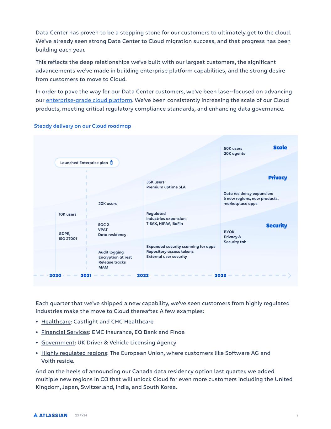 Q3 FY24 Data Center has proven to be a stepping stone for our customers to ultimately get to the cloud. We’ve already seen strong Data Center to Cloud migration success, and that progress has been building each year. This reflects the deep relationships we’ve built with our largest customers, the significant advancements we’ve made in building enterprise platform capabilities, and the strong desire from customers to move to Cloud. In order to pave the way for our Data Center customers, we’ve been laser-focused on advancing our enterprise-grade cloud platform. We’ve been consistently increasing the scale of our Cloud products, meeting critical regulatory compliance standards, and enhancing data governance. Each quarter that we’ve shipped a new capability, we’ve seen customers from highly regulated industries make the move to Cloud thereafter. A few examples: • Healthcare: Castlight and CHC Healthcare • Financial Services: EMC Insurance, EQ Bank and Finoa • Government: UK Driver & Vehicle Licensing Agency • Highly regulated regions: The European Union, where customers like Software AG and Voith reside. And on the heels of announcing our Canada data residency option last quarter, we added multiple new regions in Q3 that will unlock Cloud for even more customers including the United Kingdom, Japan, Switzerland, India, and South Korea. 7 Steady delivery on our Cloud roadmap