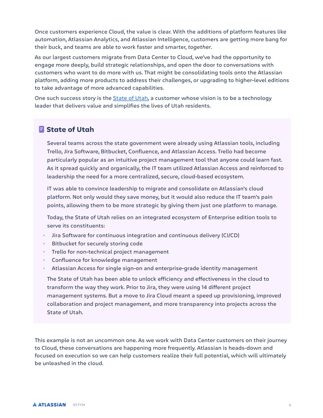 Q3 FY24 Once customers experience Cloud, the value is clear. With the additions of platform features like automation, Atlassian Analytics, and Atlassian Intelligence, customers are getting more bang for their buck, and teams are able to work faster and smarter, together. As our largest customers migrate from Data Center to Cloud, we’ve had the opportunity to engage more deeply, build strategic relationships, and open the door to conversations with customers who want to do more with us. That might be consolidating tools onto the Atlassian platform, adding more products to address their challenges, or upgrading to higher-level editions to take advantage of more advanced capabilities. One such success story is the State of Utah, a customer whose vision is to be a technology leader that delivers value and simplifies the lives of Utah residents. This example is not an uncommon one. As we work with Data Center customers on their journey to Cloud, these conversations are happening more frequently. Atlassian is heads-down and focused on execution so we can help customers realize their full potential, which will ultimately be unleashed in the cloud. 8 State of Utah Several teams across the state government were already using Atlassian tools, including Trello, Jira Software, Bitbucket, Confluence, and Atlassian Access. Trello had become particularly popular as an intuitive project management tool that anyone could learn fast. As it spread quickly and organically, the IT team utilized Atlassian Access and reinforced to leadership the need for a more centralized, secure, cloud-based ecosystem. IT was able to convince leadership to migrate and consolidate on Atlassian’s cloud platform. Not only would they save money, but it would also reduce the IT team’s pain points, allowing them to be more strategic by giving them just one platform to manage. Today, the State of Utah relies on an integrated ecosystem of Enterprise edition tools to serve its constituents: • Jira Software for continuous integration and continuous delivery (CI/CD) • Bitbucket for securely storing code • Trello for non-technical project management • Confluence for knowledge management • Atlassian Access for single sign-on and enterprise-grade identity management The State of Utah has been able to unlock efficiency and effectiveness in the cloud to transform the way they work. Prior to Jira, they were using 14 different project management systems. But a move to Jira Cloud meant a speed up provisioning, improved collaboration and project management, and more transparency into projects across the State of Utah.