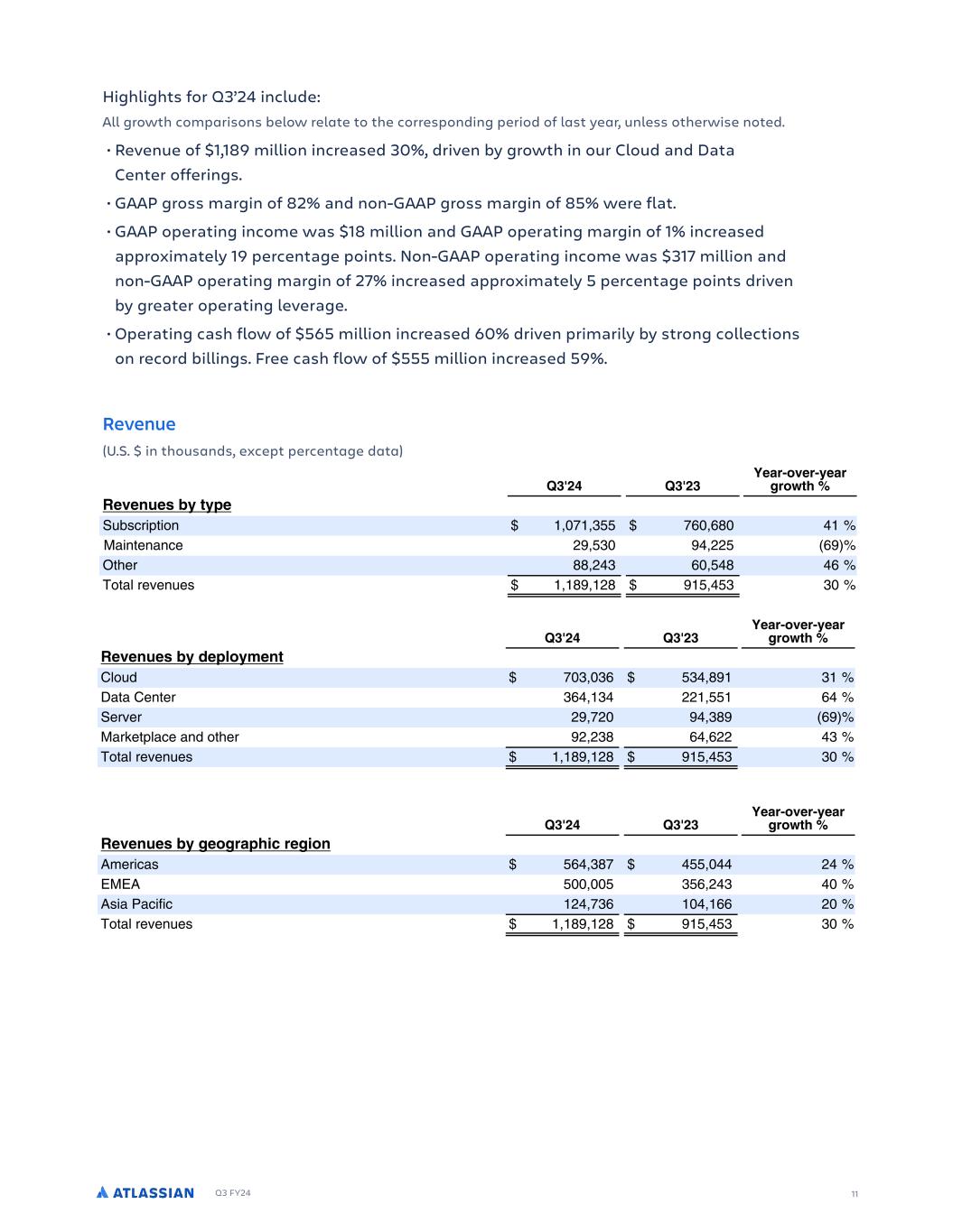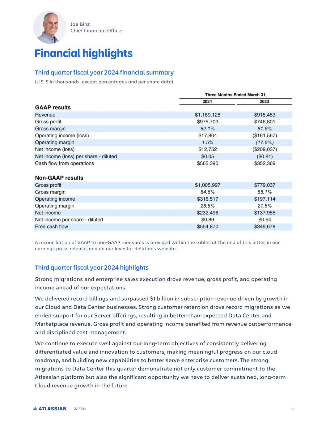 Q3 FY24 10 Third quarter fiscal year 2024 financial summary (U.S. $ in thousands, except percentages and per share data) Third quarter fiscal year 2024 highlights Strong migrations and enterprise sales execution drove revenue, gross profit, and operating income ahead of our expectations. We delivered record billings and surpassed $1 billion in subscription revenue driven by growth in our Cloud and Data Center businesses. Strong customer retention drove record migrations as we ended support for our Server offerings, resulting in better-than-expected Data Center and Marketplace revenue. Gross profit and operating income benefited from revenue outperformance and disciplined cost management. We continue to execute well against our long-term objectives of consistently delivering differentiated value and innovation to customers, making meaningful progress on our cloud roadmap, and building new capabilities to better serve enterprise customers. The strong migrations to Data Center this quarter demonstrate not only customer commitment to the Atlassian platform but also the significant opportunity we have to deliver sustained, long-term Cloud revenue growth in the future. FE I I F AJ C % %' AE E A C J DD IP L GMRP LCP D DN NDO PG OD C LC NDO DL FDP I 0FE J E D I % % % %% - 3 I J C J DSDLRD , .-( - 6OMPP NOME ., - - , - 6OMPP OF L ( % NDO LF MPP ,( () NDO LF OF L ( :D MPP . , ( ) :D MPP NDO PG OD $ C R DC %)) %. 2 PG E MT EOM MNDO MLP (. ( 1FE - 3 I J C J 6OMPP NOME . . ) - 6OMPP OF L NDO LF L M D ( , - . ( NDO LF OF L % ( % :D L M D . , -)) :D L M D NDO PG OD $ C R DC %-) % 5ODD PG E MT (. (, , . - A reconciliation of GAAP to non-GAAP measures is provided within the tables at the end of this letter, in our earnings press release, and on our Investor Relations website. Joe Binz Chief Financial Officer Financial highlights