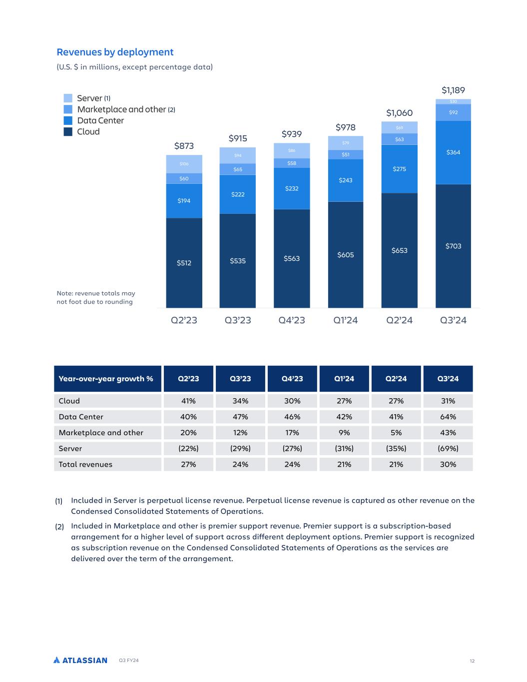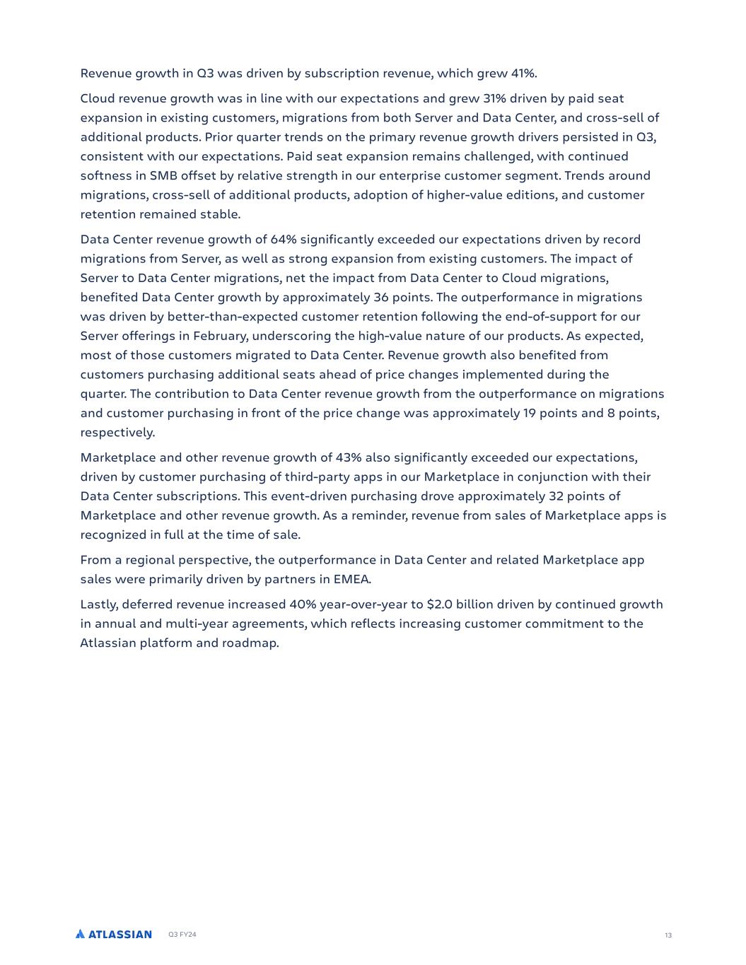 Q3 FY24 13 Revenue growth in Q3 was driven by subscription revenue, which grew 41%. Cloud revenue growth was in line with our expectations and grew 31% driven by paid seat expansion in existing customers, migrations from both Server and Data Center, and cross-sell of additional products. Prior quarter trends on the primary revenue growth drivers persisted in Q3, consistent with our expectations. Paid seat expansion remains challenged, with continued softness in SMB offset by relative strength in our enterprise customer segment. Trends around migrations, cross-sell of additional products, adoption of higher-value editions, and customer retention remained stable. Data Center revenue growth of 64% significantly exceeded our expectations driven by record migrations from Server, as well as strong expansion from existing customers. The impact of Server to Data Center migrations, net the impact from Data Center to Cloud migrations, benefited Data Center growth by approximately 36 points. The outperformance in migrations was driven by better-than-expected customer retention following the end-of-support for our Server offerings in February, underscoring the high-value nature of our products. As expected, most of those customers migrated to Data Center. Revenue growth also benefited from customers purchasing additional seats ahead of price changes implemented during the quarter. The contribution to Data Center revenue growth from the outperformance on migrations and customer purchasing in front of the price change was approximately 19 points and 8 points, respectively. Marketplace and other revenue growth of 43% also significantly exceeded our expectations, driven by customer purchasing of third-party apps in our Marketplace in conjunction with their Data Center subscriptions. This event-driven purchasing drove approximately 32 points of Marketplace and other revenue growth. As a reminder, revenue from sales of Marketplace apps is recognized in full at the time of sale. From a regional perspective, the outperformance in Data Center and related Marketplace app sales were primarily driven by partners in EMEA. Lastly, deferred revenue increased 40% year-over-year to $2.0 billion driven by continued growth in annual and multi-year agreements, which reflects increasing customer commitment to the Atlassian platform and roadmap.
