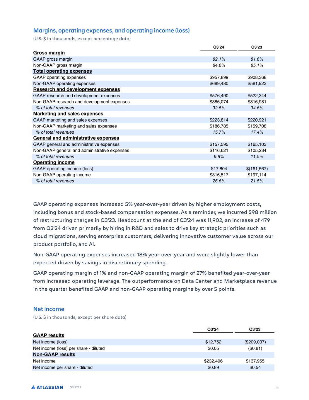 Q3 FY24 Margins, operating expenses, and operating income (loss) (U.S. $ in thousands, except percentage data) GAAP operating expenses increased 5% year-over-year driven by higher employment costs, including bonus and stock-based compensation expenses. As a reminder, we incurred $98 million of restructuring charges in Q3’23. Headcount at the end of Q3’24 was 11,902, an increase of 479 from Q2’24 driven primarily by hiring in R&D and sales to drive key strategic priorities such as cloud migrations, serving enterprise customers, delivering innovative customer value across our product portfolio, and AI. Non-GAAP operating expenses increased 18% year-over-year and were slightly lower than expected driven by savings in discretionary spending. GAAP operating margin of 1% and non-GAAP operating margin of 27% benefited year-over-year from increased operating leverage. The outperformance on Data Center and Marketplace revenue in the quarter benefited GAAP and non-GAAP operating margins by over 5 points. Net income (U.S. $ in thousands, except per share data) 14 ALMUH T EUWIU RJ JM GEO )') PEU MQ EQH RSIUEWMQ I SIQ I PPEU U T a M P % QdOQ Q TM Q PM M M P Q OQ MSQ$ > ) > ) 5UR PEU MQ g g 66D S YM SU .(% . %, B & 66D S YM SU . %, . % ARWEO RSIUEWMQ I SIQ I 66D Q M U S Qd Q Q 2.0%122 2)1%,/1 B & 66D Q M U S Qd Q Q /12%-1) .1 %2 , I IEUGL EQH HIYIORSPIQW I SIQ I 66D Q QM OT M P PQbQ YQ Qd Q Q .0/%-2) . %,-- B & 66D Q QM OT M P PQbQ YQ Qd Q Q ,1/%)0- , /%21 F F6 AG )(% ) %, :EUNIWMQ EQH EOI I SIQ I 66D YM WQ U S M P M Q Qd Q Q ,%1 - )%2 B & 66D YM WQ U S M P M Q Qd Q Q 1/%01. .2%0)1 F F6 AG %- -% 5IQIUEO EQH EHPMQM WUEWMYI I SIQ I 66D SQ Q M M P MPYU U M UbQ Qd Q Q .0%.2. /.% ), B & 66D SQ Q M M P MPYU U M UbQ Qd Q Q /%/ ).% ,- F F6 AG %. % SIUEWMQ MQGRPI 66D Q M U S U O YQ $ 0%1)- / %./0$ B & 66D Q M U S U O YQ , /%. 0 20% - F F6 AG (,%, ( % ) ALMUH T EUWIU RJ JM GEO )') IW QGRPI U T a M P % QdOQ Q TM Q PM M$ > ) > ) 5// UI OW BQ U O YQ $ %0. )2%),0$ BQ U O YQ $ Q TM Q & PU a QP )'). )'1 $ RQ%5// UI OW BQ U O YQ , %-2/ ,0%2.. BQ U O YQ Q TM Q & PU a QP )'12 )'.- ALMUH T EUWIU RJ JM GEO )') 4UII 1E L 4OR U T a M P % QdOQ Q OQ MSQ$ > ) > ) 4UII GE L JOR 66D Q OM T bUPQP Ne Q M U S MO UbU UQ ./.%,2) ,. %,/2 @Q 3 8M U M Qd Q PU a Q )%. )$ %/2 $ ; QQ OM T R c ..-%10) ,-2%/01 F F6 AG ,%- ).%(