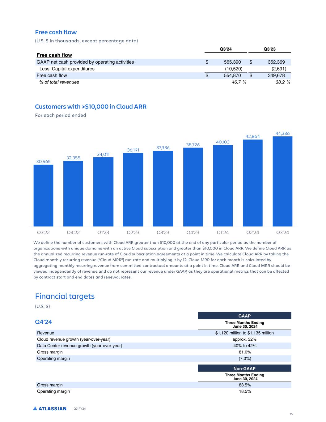 Q3 FY24 Free cash flow (U.S. $ in thousands, except percentage data) Customers with >$10,000 in Cloud ARR For each period ended Financial targets (U.S. $) Q4’24 4MQEQGMEO AEU IW  5// ALUII :RQWL 3QHMQ QI '$ )') FQbQ aQ % ) YU U % ,. YU U 8 aP QbQ aQ S c T eQM & bQ &eQM $ M d' , 9M M 8Q Q QbQ aQ S c T eQM & bQ &eQM $ -) - YM SU 1 ') C Q M U S YM SU 0') $ RQ%5// ALUII :RQWL 3QHMQ QI '$ )') YM SU 1,'. C Q M U S YM SU 1'.  , 15 ALMUH T EUWIU RJ JM GEO )') IW QGRPI U T a M P % QdOQ Q TM Q PM M$ > ) > ) 5// UI OW BQ U O YQ $ %0. )2%),0$ BQ U O YQ $ Q TM Q & PU a QP )'). )'1 $ RQ%5// UI OW BQ U O YQ , %-2/ ,0%2.. BQ U O YQ Q TM Q & PU a QP )'12 )'.- ALMUH T EUWIU RJ JM GEO )') 4UII 1E L 4OR U T a M P % QdOQ Q OQ MSQ$ > ) > ) 4UII GE L JOR 66D Q OM T bUPQP Ne Q M U S MO UbU UQ ./.%,2) ,. %,/2 @Q 3 8M U M Qd Q PU a Q )%. )$ %/2 $ ; QQ OM T R c ..-%10) ,-2%/01 F F6 AG ,%- ).%(   Q3’22 Q4’22 Q1’23 Q2’23 Q3’23 Q4’23 Q1’24 Q2’24 Q3’24 44,336 42,864 40,10338,72637,33636,191 34,011 32,355 30,565 We define the number of customers with Cloud ARR greater than $10,000 at the end of any particular period as the number of organizations with unique domains with an active Cloud subscription and greater than $10,000 in Cloud ARR. We define Cloud ARR as the annualized recurring revenue run-rate of Cloud subscription agreements at a point in time. We calculate Cloud ARR by taking the Cloud monthly recurring revenue (“Cloud MRR”) run-rate and multiplying it by 12. Cloud MRR for each month is calculated by aggregating monthly recurring revenue from committed contractual amounts at a point in time. Cloud ARR and Cloud MRR should be viewed independently of revenue and do not represent our revenue under GAAP, as they are operational metrics that can be affected by contract start and end dates and renewal rates.