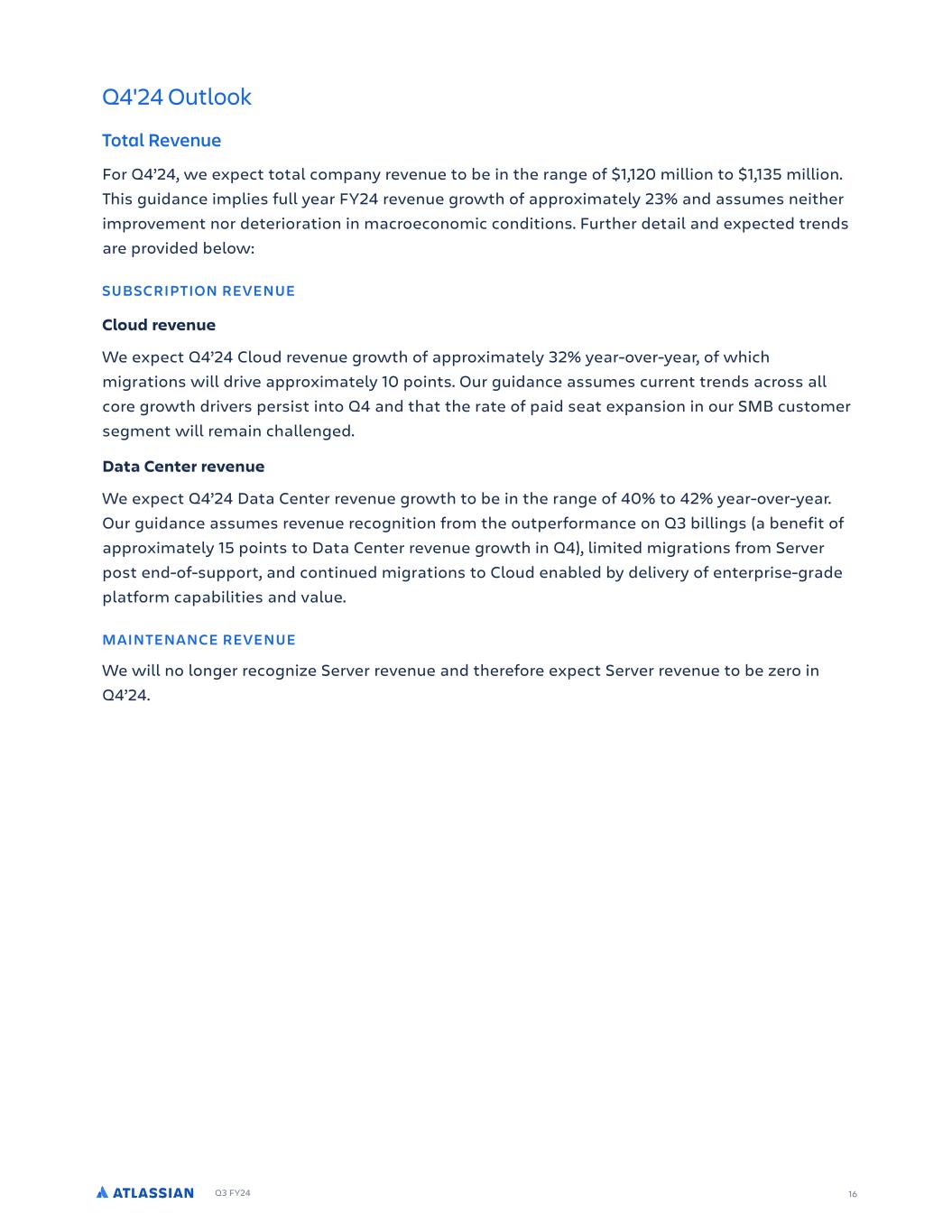 Q3 FY24 16 Q4'24 Outlook Total Revenue For Q4’24, we expect total company revenue to be in the range of $1,120 million to $1,135 million. This guidance implies full year FY24 revenue growth of approximately 23% and assumes neither improvement nor deterioration in macroeconomic conditions. Further detail and expected trends are provided below: SUBSCRIPTION REVENUE Cloud revenue We expect Q4’24 Cloud revenue growth of approximately 32% year-over-year, of which migrations will drive approximately 10 points. Our guidance assumes current trends across all core growth drivers persist into Q4 and that the rate of paid seat expansion in our SMB customer segment will remain challenged. Data Center revenue We expect Q4’24 Data Center revenue growth to be in the range of 40% to 42% year-over-year. Our guidance assumes revenue recognition from the outperformance on Q3 billings (a benefit of approximately 15 points to Data Center revenue growth in Q4), limited migrations from Server post end-of-support, and continued migrations to Cloud enabled by delivery of enterprise-grade platform capabilities and value. MAINTENANCE REVENUE We will no longer recognize Server revenue and therefore expect Server revenue to be zero in Q4’24.