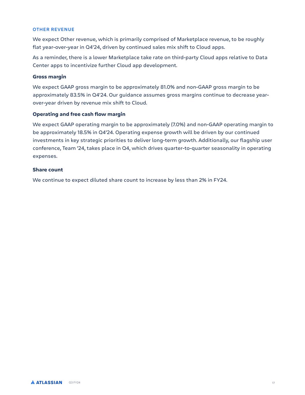 Q3 FY24 17 OTHER REVENUE We expect Other revenue, which is primarily comprised of Marketplace revenue, to be roughly flat year-over-year in Q4'24, driven by continued sales mix shift to Cloud apps. As a reminder, there is a lower Marketplace take rate on third-party Cloud apps relative to Data Center apps to incentivize further Cloud app development. Gross margin We expect GAAP gross margin to be approximately 81.0% and non-GAAP gross margin to be approximately 83.5% in Q4'24. Our guidance assumes gross margins continue to decrease year- over-year driven by revenue mix shift to Cloud. Operating and free cash flow margin We expect GAAP operating margin to be approximately (7.0%) and non-GAAP operating margin to be approximately 18.5% in Q4’24. Operating expense growth will be driven by our continued investments in key strategic priorities to deliver long-term growth. Additionally, our flagship user conference, Team ’24, takes place in Q4, which drives quarter-to-quarter seasonality in operating expenses. Share count We continue to expect diluted share count to increase by less than 2% in FY24.