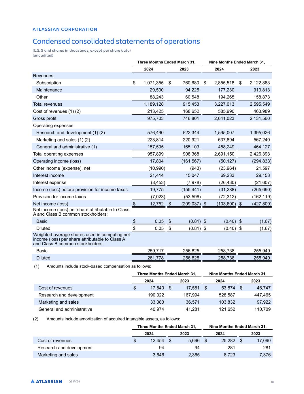 Q3 FY24 18 ATLASSIAN CORPORATION Condensed consolidated statements of operations (U.S. $ and shares in thousands, except per share data) (unaudited) S ARR AM 1N ON AS NM 1NMDEMRED 1NMRN DASED SASELEMSR NF :OE AS NMR % % AMD R A ER M S NTRAMDR EWCEOS OE R A E DASA TMATD SED  EE 8NMS R 3MDED 8A C ) ME 8NMS R 3MDED 8A C ) ( ( ( () ( ( ( () FWFO FT0 CTDS PO - ) -, ,. ( . . ( (( .,) :B O FOBODF ( ) (( -- () ) ) . ) IFS .. ( ) , . (, . .-) P BM SFWFO FT . (. ) ) ((- ) ( 3PT PG SFWFO FT ( ( ) ( ,. , ( . ,) . 7SPTT SPG - - ) - , . ( , () ( ) , FSB O F FOTFT0 FTFBSDI BOE EFWFMP NFO ( -, (( ) - ) (, :BSLF O BOE TBMFT ( (() . (( ( ,)- . ,- ( 7FOFSBM BOE BEN O T SB WF - , ) . ( , (- P BM P FSB O F FOTFT - . . ),. ( , ( (, ) ) FSB O ODPNF MPTT - . , ,- (- ( .)) IFS ODPNF F FOTF OF ) () , ( - 8O FSFT ODPNF ( - , ()) ( ) 8O FSFT F FOTF . ) - -. (, ) ( , - 8ODPNF MPTT CFGPSF SPW T PO GPS ODPNF B FT -- ) (.. (, , SPW T PO GPS ODPNF B FT - () ) , -( ) ( ,( F ODPNF MPTT ( - ( ( )- ) , (- . F ODPNF MPTT FS TIBSF B S C BCMF P 3MBTT 1 BOE 3MBTT 2 DPNNPO T PDLIPMEFST0 2BT D % %. % %,- 4 M FE % %. % %,- AF I FE$BWFSB F TIBSFT TFE O DPN O OF ODPNF MPTT FS TIBSF B S C BCMF P 3MBTT 1 BOE 3MBTT 2 DPNNPO T PDLIPMEFST0 2BT D ( - - ( , .( ( . -). ( 4 M FE (, --. ( , .( ( . -). ( 1NP O T ODM EF T PDL$CBTFE DPN FOTB PO BT GPMMP T0 EE 8NMS R 3MDED 8A C ) ME 8NMS R 3MDED 8A C ) ( ( ( () ( ( ( () 3PT PG SFWFO FT - . - . ) .- , - - FTFBSDI BOE EFWFMP NFO )(( ,- (. .- - , :BSLF O BOE TBMFT )) ).) ), - ) .)( - (( 7FOFSBM BOE BEN O T SB WF - (. ( , ( - ( 1NP O T ODM EF BNPS B PO PG BDR SFE O BO CMF BTTF T BT GPMMP T0 EE 8NMS R 3MDED 8A C ) ME 8NMS R 3MDED 8A C ) ( ( ( () ( ( ( () 3PT PG SFWFO FT ( , , ( (.( - FTFBSDI BOE EFWFMP NFO (. (. :BSLF O BOE TBMFT ) , , ( ), . -() - )-,