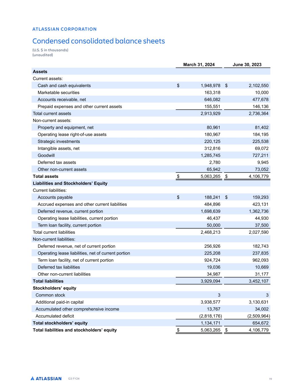 Q3 FY24 19 S ARR AM 1N ON AS NM 1NMDEMRED 1NMRN DASED 0A AMCE EESR % % M S NTRAMDR TMATD SED 8A C ) ( ( TME ) ( () RRESR 3 SSFO BTTF T0 3BTI BOE DBTI FR WBMFO T . -. ( ( :BSLF BCMF TFD S FT ,) ) . 1DDP O T SFDF WBCMF OF , , .( -- ,-. SF B E F FOTFT BOE P IFS D SSFO BTTF T , ), P BM D SSFO BTTF T ( ) ( ( -), ), PO$D SSFO BTTF T0 SP FS BOE FR NFO OF . , . ( FSB O MFBTF S I $PG$ TF BTTF T . ,- . SB F D OWFT NFO T (( ( (( ). 8O BO CMF BTTF T OF ) ( . , , -( 7PPE MM (. - -(- ( 4FGFSSFE B BTTF T ( -. IFS OPO$D SSFO BTTF T , ( -) ( NSA ARRESR ,) (, , -- 7 AB S ER AMD SNCJ N DE R 3PT S 3 SSFO M BC M FT0 1DDP O T B BCMF .. ( ( ) 1DDS FE F FOTFT BOE P IFS D SSFO M BC M FT . . , () ) 4FGFSSFE SFWFO F D SSFO PS PO , . ,) ),( -), FSB O MFBTF M BC M FT D SSFO PS PO , )- ) FSN MPBO GBD M D SSFO PS PO )- P BM D SSFO M BC M FT ( ,. ( ) ( (- PO$D SSFO M BC M FT0 4FGFSSFE SFWFO F OF PG D SSFO PS PO ( , (, .( - ) FSB O MFBTF M BC M FT OF PG D SSFO PS PO (( ( . ()- .) FSN MPBO GBD M OF PG D SSFO PS PO ( -( ,( ) 4FGFSSFE B M BC M FT ), ,, IFS OPO$D SSFO M BC M FT ) .- ) -- NSA AB S ER ) ( ) ( - SNCJ N DE R EPT S 3PNNPO T PDL ) ) 1EE POBM B E$ O DB BM ) ). -- ) ) ,) 1DD N MB FE P IFS DPN SFIFOT WF ODPNF ) -,- ) ( 1DD N MB FE EFG D ( . . -, ( , NSA RSNCJ N DE R EPT S ) - , ,-( NSA AB S ER AMD RSNCJ N DE R EPT S ,) (, , -- , ATLASSIAN CORPORATION Condensed consolidated balance sheets (U.S. $ in thousands) (unaudited)