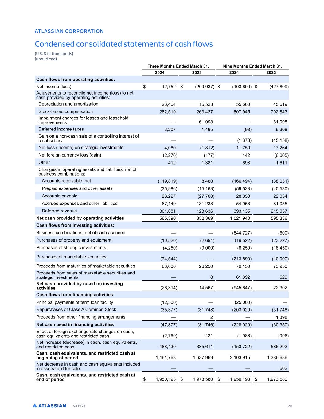 Q3 FY24 20 S ARR AM 1N ON AS NM 1NMDEMRED 1NMRN DASED SASELEMSR NF 1AR 4 N R % % M S NTRAMDR TMATD SED          EE 8NMS R 3MDED 8A C ) ME 8NMS R 3MDED 8A C ) ( ( ( () ( ( ( () 1AR F N R F NL NOE AS MG ACS U S ER. F ODPNF MPTT ( - ( ( )- ) , (- . 1E T NFO T P SFDPOD MF OF ODPNF MPTT P OF DBTI SPW EFE C P FSB O BD W FT0 4F SFD B PO BOE BNPS B PO () , () , , PDL$CBTFE DPN FOTB PO (.( (,) (- . - - ( . ) 8N B SNFO DIBS FT GPS MFBTFT BOE MFBTFIPME N SPWFNFO T , . , . 4FGFSSFE ODPNF B FT ) ( - . , ) . 7B O PO B OPO$DBTI TBMF PG B DPO SPMM O O FSFT PG B T CT E BS )-. . F MPTT ODPNF PO T SB F D OWFT NFO T , . ( - - (, F GPSF O D SSFOD MPTT B O ( (-, -- ( , IFS ( ). , . , 3IBO FT O P FSB O BTTF T BOE M BC M FT OF PG C T OFTT DPNC OB POT0 1DDP O T SFDF WBCMF OF . . , ,, ). ) SF B E F FOTFT BOE P IFS BTTF T ) ., ,) (. ) 1DDP O T B BCMF (. ((- (- - (. . (( ) 1DDS FE F FOTFT BOE P IFS M BC M FT ,- ) (). . . 4FGFSSFE SFWFO F ) ,. () ,), ) ) ) ( )- ES CAR O NU DED B NOE AS MG ACS U S ER , ) ) ( ), ( )), 1AR F N R F NL MUERS MG ACS U S ER. 2 T OFTT DPNC OB POT OF PG DBTI BDR SFE . -(- , SDIBTFT PG SP FS BOE FR NFO ( ( , (( () ((- SDIBTFT PG T SB F D OWFT NFO T ( . ( . SDIBTFT PG NBSLF BCMF TFD S FT - ( ) , SPDFFET GSPN NB S FT PG NBSLF BCMF TFD S FT ,) (, ( - -) SPDFFET GSPN TBMFT PG NBSLF BCMF TFD S FT BOE T SB F D OWFT NFO T . , ) ( ,( ES CAR O NU DED B TRED M MUERS MG ACS U S ER (, ) ,- , - (( ) ( 1AR F N R F NL F MAMC MG ACS U S ER. S OD BM B NFO T PG FSN MPBO GBD M ( ( F SDIBTFT PG 3MBTT 1 3PNNPO PDL ) )-- ) - . ( ) ( ) - . SPDFFET GSPN P IFS G OBOD O BSSBO FNFO T ( ) . ES CAR TRED M F MAMC MG ACS U S ER - .-- ) - , ((. ( ) ) 5GGFD PG GPSF O F DIBO F SB F DIBO FT PO DBTI DBTI FR WBMFO T BOE SFT S D FE DBTI ( -, ( ., , F ODSFBTF EFDSFBTF O DBTI DBTI FR WBMFO T BOE SFT S D FE DBTI .. ) )) , ) -(( ., ( ( 1AR CAR EPT UA EMSR AMD ERS CSED CAR AS BEG MM MG NF OE ND , -,) ,)- , ( ) )., ,., F EFDSFBTF O DBTI BOE DBTI FR WBMFO T ODM EFE O BTTF T IFME GPS TBMF , ( 1AR CAR EPT UA EMSR AMD ERS CSED CAR AS EMD NF OE ND ) -) . ) -) . - ATLASSIAN CORPORATION Condensed consolidated statements of cash flows (U.S. $ in thousands) (unaudited)
