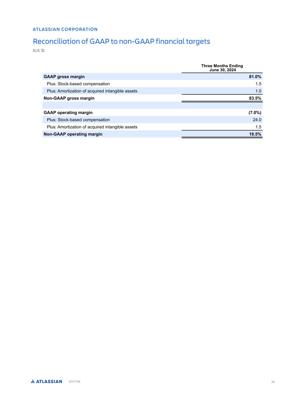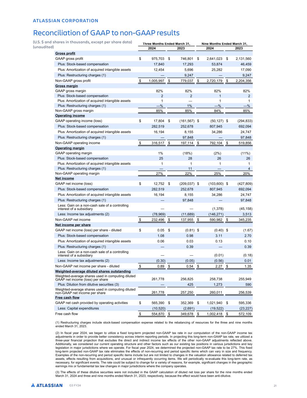 Q3 FY24 21 G FF CE CE G C 3 C G C C . 2 GC 0C . 2 3 F GF $4$ F E F G C F F G E G E F E G G E C G F , E ( 0 C G F , E ( ) ( ) ( .ECFF EC G 611 F NRR NE S - - ) - , . ( , () ( ) , TR0 SN $A RDC NL DMR S NM - . - ( ) ) .- , TR0 1LN S S NM NE PT DC MS MF A D RRDSR ( , , ( (.( - TR0 DRS T ST MF G FDR ( - ( - :NM$611 F NRR NE S - -- )- ( -( - ( ( ) , .ECFF A E 611 F NRR L F M .( .( .( .( TR0 SN $A RDC NL DMR S NM ( ( ( TR0 1LN S S NM NE PT DC MS MF A D RRDSR TR0 DRS T ST MF G FDR :NM$611 F NRR L F M . . . . 1 E G CA 611 N D S MF M NLD NRR - . , ,- (- ( .)) TR0 SN $A RDC NL DMR S NM (.( ( ( ,-. . - , ( TR0 1LN S S NM NE PT DC MS MF A D RRDSR , . ) (., ( - - TR0 DRS T ST MF G FDR - . . - . . :NM$611 N D S MF M NLD ) , - - - ( . , 1 E G A E 611 N D S MF L F M . ( TR0 SN $A RDC NL DMR S NM ( (. (, (, TR0 1LN S S NM NE PT DC MS MF A D RRDSR TR0 DRS T ST MF G FDR :NM$611 N D S MF L F M (- (( ( ( 0 G CA 611 MDS M NLD NRR ( - ( ( )- ) , (- . TR0 SN $A RDC NL DMR S NM (.( ( ( ,-. . - , ( TR0 1LN S S NM NE PT DC MS MF A D RRDSR , . ) (., ( - - TR0 DRS T ST MF G FDR - . . - . . 8DRR0 6 M NM MNM$ RG R D NE NMS N MF MSD DRS NE RTAR C )-. . 8DRR0 7M NLD S W CITRSLDMSR ( -. , ,. , (- ) ) :NM$611 MDS M NLD ()( , )- .( ) () 0 G CA E F E 611 MDS M NLD NRR D RG D $ C TSDC % %. % %,- TR0 SN $A RDC NL DMR S NM % . % . )% (%- TR0 1LN S S NM NE PT DC MS MF A D RRDSR % , % ) % ) % TR0 DRS T ST MF G FDR %) %) 8DRR0 6 M NM MNM$ RG R D NE NMS N MF MSD DRS NE RTAR C % % . 8DRR0 7M NLD S W CITRSLDMSR ( %) % % , % :NM$611 MDS M NLD D RG D $ C TSDC %. % (%(- %) G E G F E F C GFG D FGSDC$ D FD RG DR TRDC M NL TS MF C TSDC 611 MDS M NLD NRR D RG D (, --. ( , .( ( . -). ( TR0 3 TS NM E NL C TS D RD T S DR ) ( (-) D FGSDC$ D FD RG DR TRDC M NL TS MF C TSDC MNM$611 MDS M NLD D RG D (, --. ( - ( (, ( , ) -E F C 611 MDS RG N CDC A N D S MF S S DR , ) ) ( ), ( )), 8DRR0 2 S DW DMC ST DR ( ( , (( () ((- 5 DD RG E N .- ) ,-. ( . -( ATLASSIAN CORPORATION Reconciliation of GAAP to non-GAAP results (U.S. $ and shares in thousands, except per share data) (unaudited) FT S D S O DIBS FT ODM EF T PDL$CBTFE DPN FOTB PO F FOTF SFMB FE P IF SFCBMBOD O PG SFTP SDFT GPS IF ISFF BOE O OF NPO IT FOEFE :BSDI ) ( ()% ( 8O G TDBM FBS ( ( F CF BO P M F B G FE MPO $ FSN SP FD FE OPO$711 B SB F O P S DPN B PO PG IF OPO$711 ODPNF B BE T NFO T O PSEFS P SPW EF CF FS DPOT T FOD BDSPTT O FS N SF PS O FS PET% 8O SP FD O I T MPO $ FSN OPO$711 B SB F F M FE B ISFF$ FBS G OBOD BM SP FD PO IB F DM EFT IF E SFD BOE OE SFD ODPNF B FGGFD T PG IF P IFS OPO$711 BE T NFO T SFGMFD FE BCPWF% 1EE POBMM F DPOT EFSFE P S D SSFO P FSB O T S D SF BOE P IFS GBD PST T DI BT P S F T O B PT POT O WBS P T S TE D POT BOE LF MF TMB PO O NB PS S TE D POT IFSF F P FSB F% 6PS G TDBM FBS ( ( F EF FSN OFE IF SP FD FE OPO$711 B SB F P CF (- % I T G FE MPO $ FSN SP FD FE OPO$711 B SB F FM N OB FT IF FGGFD T PG OPO$SFD SS O BOE FS PE T FD G D FNT I DI DBO WBS O T F BOE GSFR FOD % 5 BN MFT PG IF OPO$SFD SS O BOE FS PE T FD G D FNT ODM EF C BSF OP M N FE P DIBO FT O IF WBM B PO BMMP BODF SFMB FE P EFGFSSFE B BTTF T FGGFD T SFT M O GSPN BDR T POT BOE O T BM PS OGSFR FO M PDD SS O FNT% AF MM FS PE DBMM SF$FWBM B F I T MPO $ FSN SB F BT OFDFTTBS GPS T O G DBO FWFO T% IF SB F DP ME CF T C FD P DIBO F GPS B WBS F PG SFBTPOT GPS F BN MF T O G DBO DIBO FT O IF FP SB I D FBSO O T N PS G OEBNFO BM B MB DIBO FT O NB PS S TE D POT IFSF IF DPN BO P FSB FT% ) IF FGGFD T PG IFTF E M WF TFD S FT FSF OP ODM EFE O IF 711 DBMD MB PO PG E M FE OF MPTT FS TIBSF GPS IF O OF NPO IT FOEFE :BSDI ) ( ( BOE ISFF BOE O OF NPO IT FOEFE :BSDI ) ( () SFT FD WFM CFDB TF IF FGGFD P ME IBWF CFFO BO $E M WF%