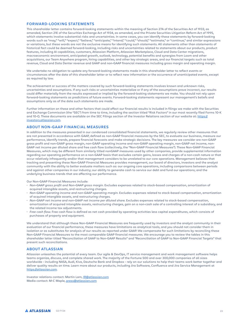 Q3 FY24 23 FORWARD-LOOKING STATEMENTS This shareholder letter contains forward-looking statements within the meaning of Section 27A of the Securities Act of 1933, as amended, Section 21E of the Securities Exchange Act of 1934, as amended, and the Private Securities Litigation Reform Act of 1995, which statements involve substantial risks and uncertainties. In some cases, you can identify these statements by forward-looking words such as “may,” “will,” “expect,” “believe,” “anticipate,” “intend,” “could,” “should,” “estimate,” or “continue,” and similar expressions or variations, but these words are not the exclusive means for identifying such statements. All statements other than statements of historical fact could be deemed forward-looking, including risks and uncertainties related to statements about our products, product features, including AI capabilities, customers, Atlassian Platform, Atlassian Marketplace, Cloud and Data Center migrations, macroeconomic environment, anticipated growth, outlook, technology, potential benefits and synergies from Loom and other acquisitions, our Team Anywhere program, hiring capabilities, and other key strategic areas, and our financial targets such as total revenue, Cloud and Data Denter revenue and GAAP and non-GAAP financial measures including gross margin and operating margin. We undertake no obligation to update any forward-looking statements made in this shareholder letter to reflect events or circumstances after the date of this shareholder letter or to reflect new information or the occurrence of unanticipated events, except as required by law. The achievement or success of the matters covered by such forward-looking statements involves known and unknown risks, uncertainties and assumptions. If any such risks or uncertainties materialize or if any of the assumptions prove incorrect, our results could differ materially from the results expressed or implied by the forward-looking statements we make. You should not rely upon forward-looking statements as predictions of future events. Forward-looking statements represent our management’s beliefs and assumptions only as of the date such statements are made. Further information on these and other factors that could affect our financial results is included in filings we make with the Securities and Exchange Commission (the “SEC”) from time to time, including the section titled “Risk Factors” in our most recently filed Forms 10-K and 10-Q. These documents are available on the SEC Filings section of the Investor Relations section of our website at: https:// investors.atlassian.com. ABOUT NON-GAAP FINANCIAL MEASURES In addition to the measures presented in our condensed consolidated financial statements, we regularly review other measures that are not presented in accordance with GAAP, defined as non-GAAP financial measures by the SEC, to evaluate our business, measure our performance, identify trends, prepare financial forecasts and make strategic decisions. The key measures we consider are non-GAAP gross profit and non-GAAP gross margin, non-GAAP operating income and non-GAAP operating margin, non-GAAP net income, non- GAAP net income per diluted share and free cash flow (collectively, the “Non-GAAP Financial Measures”). These Non-GAAP Financial Measures, which may be different from similarly titled nonGAAP measures used by other companies, provide supplemental information regarding our operating performance on a non-GAAP basis that excludes certain gains, losses and charges of a non-cash nature or that occur relatively infrequently and/or that management considers to be unrelated to our core operations. Management believes that tracking and presenting these Non-GAAP Financial Measures provides management, our board of directors, investors and the analyst community with the ability to better evaluate matters such as: our ongoing core operations, including comparisons between periods and against other companies in our industry; our ability to generate cash to service our debt and fund our operations; and the underlying business trends that are affecting our performance. Our Non-GAAP Financial Measures include: • Non-GAAP gross profit and Non-GAAP gross margin. Excludes expenses related to stock-based compensation, amortization of acquired intangible assets, and restructuring charges. • Non-GAAP operating income and non-GAAP operating margin. Excludes expenses related to stock-based compensation, amortization of acquired intangible assets, and restructuring charges. • Non-GAAP net income and non-GAAP net income per diluted share. Excludes expenses related to stock-based compensation, amortization of acquired intangible assets, restructuring charges, gain on a non-cash sale of a controlling interest of a subsidiary, and the related income tax adjustments. • Free cash flow. Free cash flow is defined as net cash provided by operating activities less capital expenditures, which consists of purchases of property and equipment. We understand that although these Non-GAAP Financial Measures are frequently used by investors and the analyst community in their evaluation of our financial performance, these measures have limitations as analytical tools, and you should not consider them in isolation or as substitutes for analysis of our results as reported under GAAP. We compensate for such limitations by reconciling these Non-GAAP Financial Measures to the most comparable GAAP financial measures. We encourage you to review the tables in this shareholder letter titled “Reconciliation of GAAP to Non-GAAP Results” and “Reconciliation of GAAP to Non-GAAP Financial Targets” that present such reconciliations. ABOUT ATLASSIAN Atlassian unleashes the potential of every team. Our agile & DevOps, IT service management and work management software helps teams organize, discuss, and complete shared work. The majority of the Fortune 500 and over 300,000 comp
