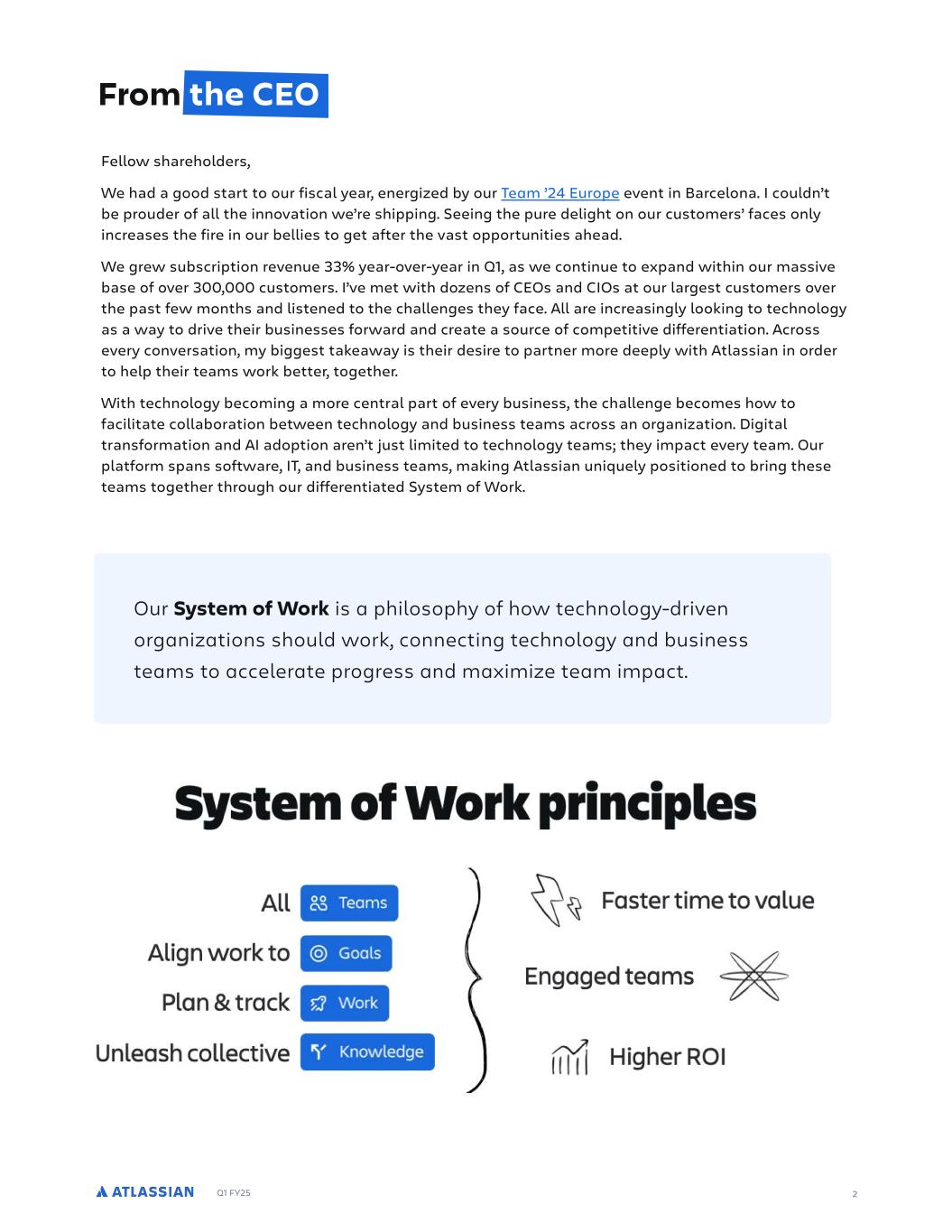 Q1 FY25 Fellow shareholders, We had a good start to our fiscal year, energized by our Team ’24 Europe event in Barcelona. I couldn’t be prouder of all the innovation we’re shipping. Seeing the pure delight on our customers’ faces only increases the fire in our bellies to get after the vast opportunities ahead. We grew subscription revenue 33% year-over-year in Q1, as we continue to expand within our massive base of over 300,000 customers. I’ve met with dozens of CEOs and CIOs at our largest customers over the past few months and listened to the challenges they face. All are increasingly looking to technology as a way to drive their businesses forward and create a source of competitive differentiation. Across every conversation, my biggest takeaway is their desire to partner more deeply with Atlassian in order to help their teams work better, together. With technology becoming a more central part of every business, the challenge becomes how to facilitate collaboration between technology and business teams across an organization. Digital transformation and AI adoption aren’t just limited to technology teams; they impact every team. Our platform spans software, IT, and business teams, making Atlassian uniquely positioned to bring these teams together through our differentiated System of Work. From the CEO 2 Our System of Work is a philosophy of how technology-driven organizations should work, connecting technology and business teams to accelerate progress and maximize team impact.